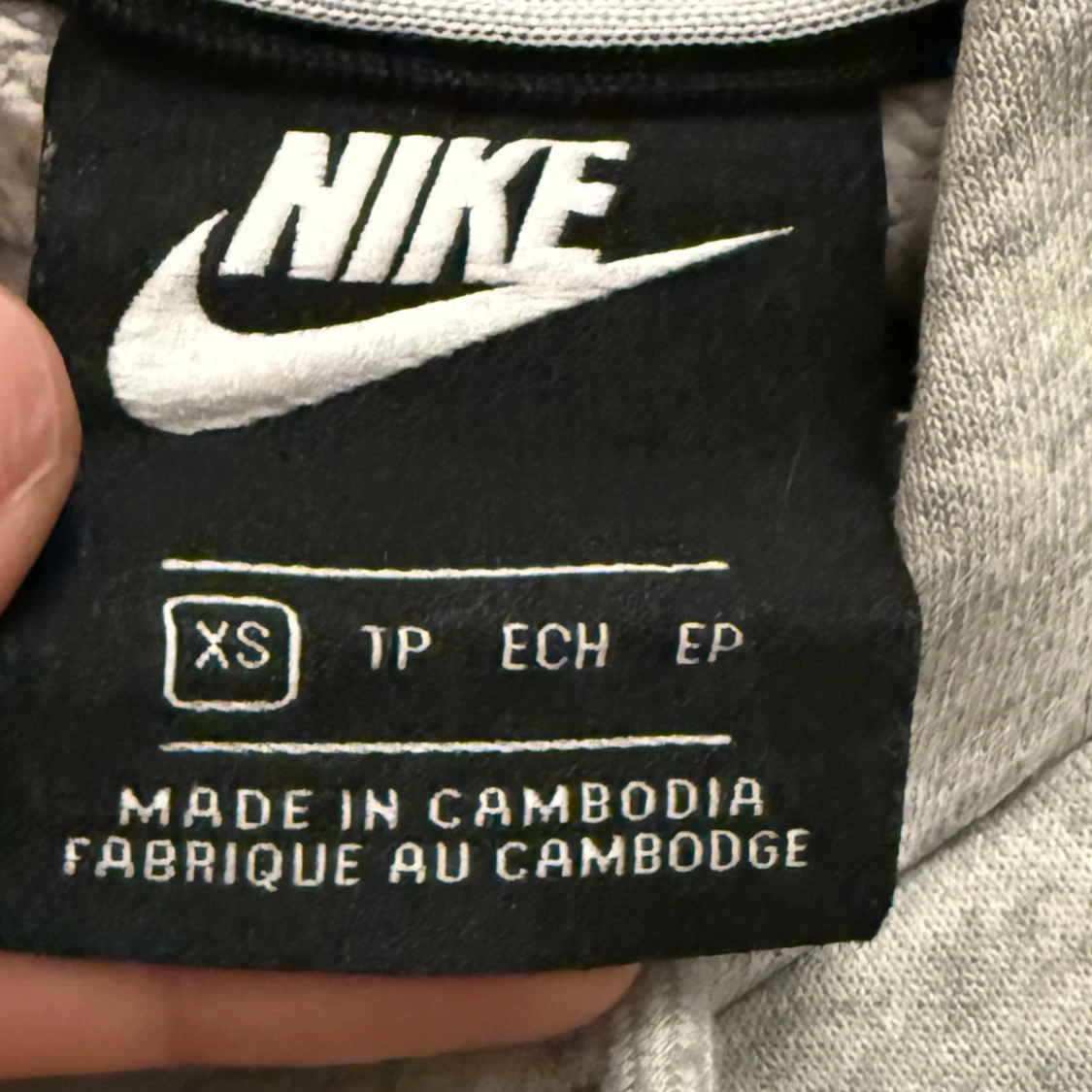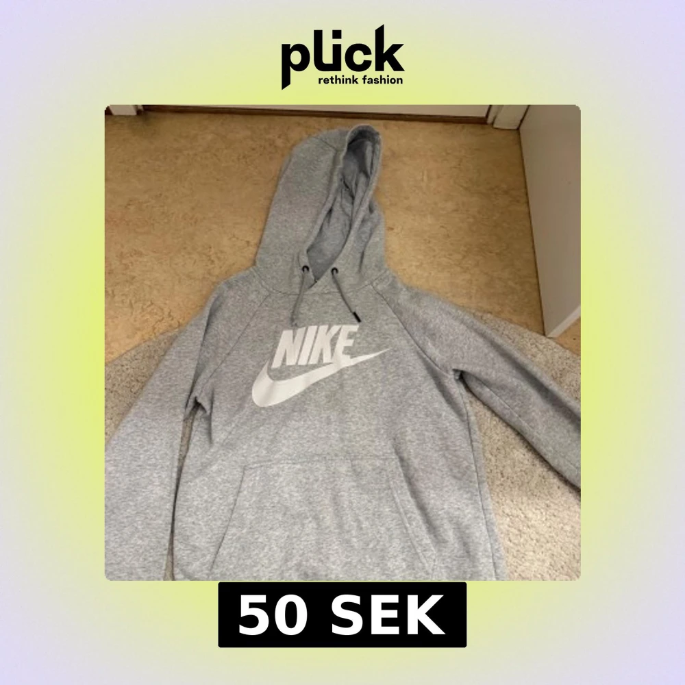 Säljer en klassisk grå hoodie från Nike med stor vit logga på bröstet.