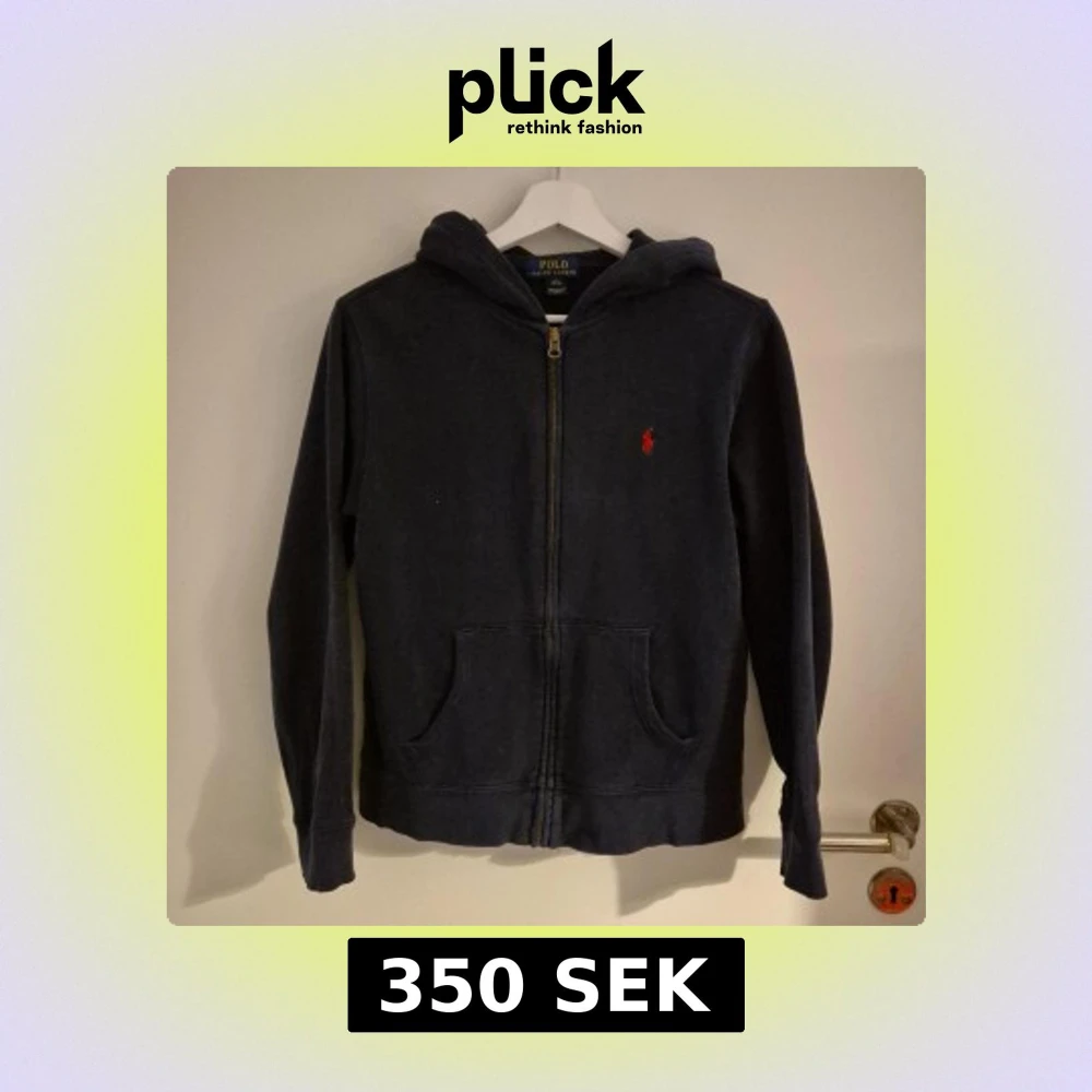 Säljer en snygg mörkblå zip up från Ralph Lauren med dragkedja och huva. Den har en klassisk design med det ikoniska röda logotypen på bröstet och praktiska fickor framtill. Perfekt för en avslappnad stil.