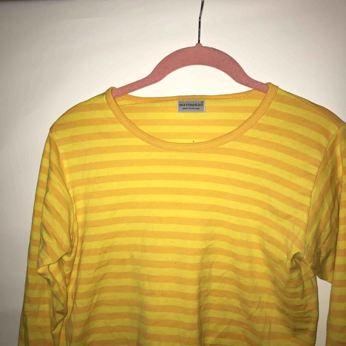 Gulrandig Marrimekko tröja, liten storlek men sitter snyggt på. Storlekslappen saknas men passar mig som har 34, har trekvartslånga ärmar. Skick: använt Möts upp i Stockholm eller skickar. Köpare står för frakt.