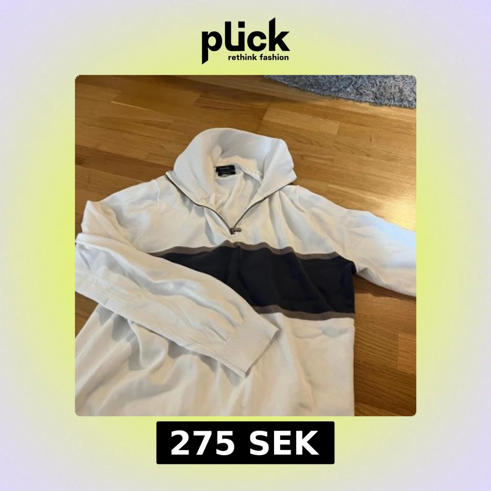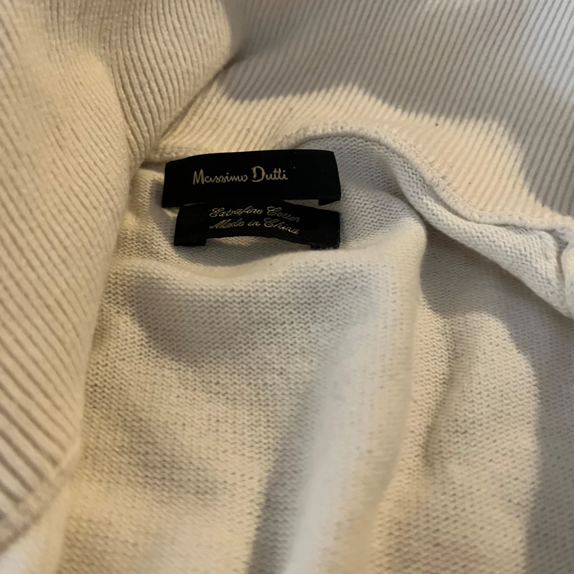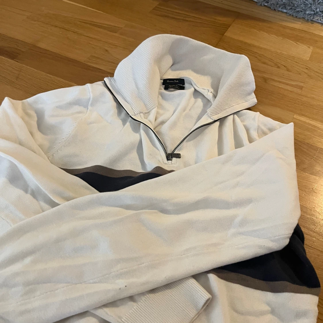 Vit långärmad tröja från Massimo Dutti med bred mörkblå rand över bröstet och dragkedja vid kragen. Tröjan har ribbade muddar och en hög krage som kan vikas ner. Perfekt för en stilren och avslappnad look.