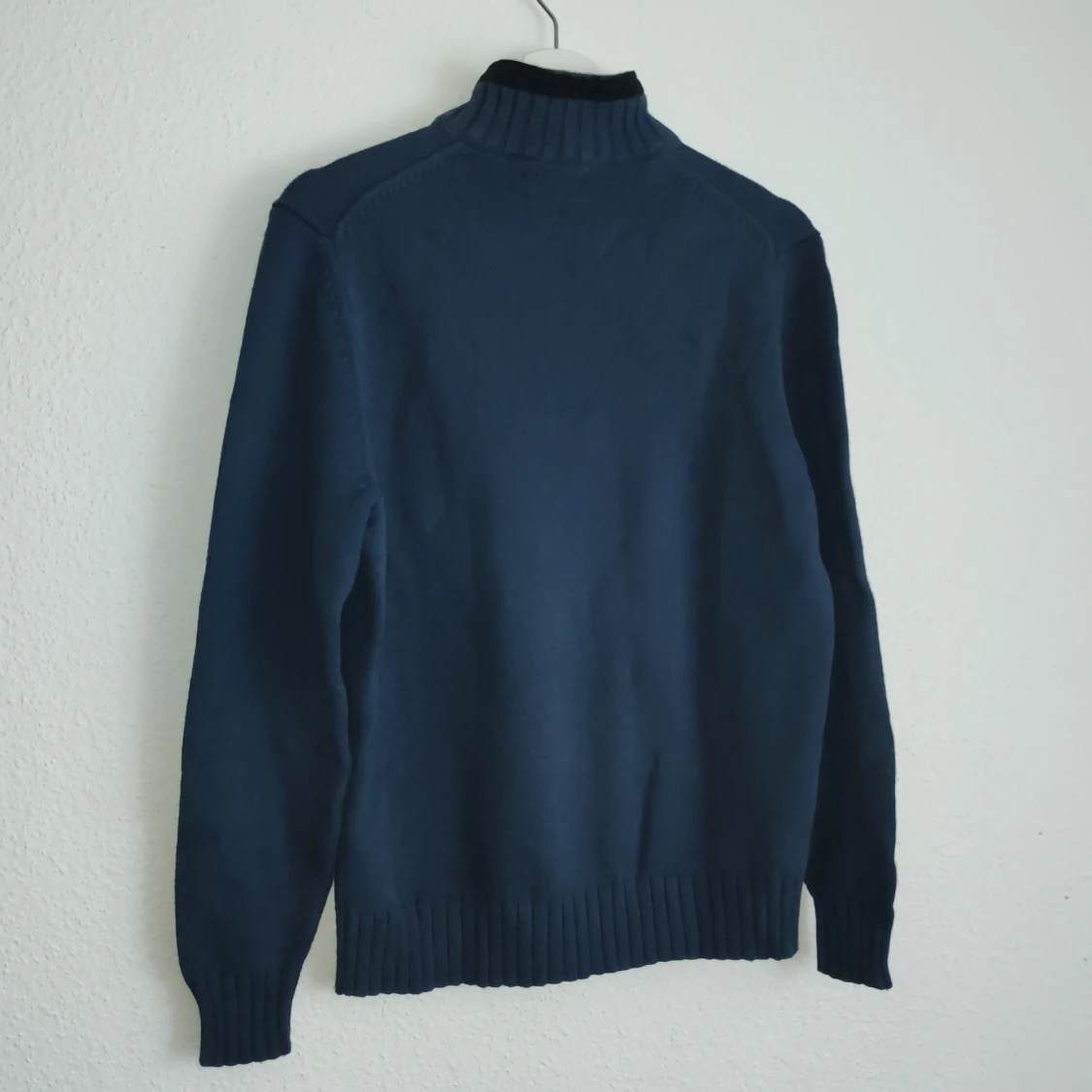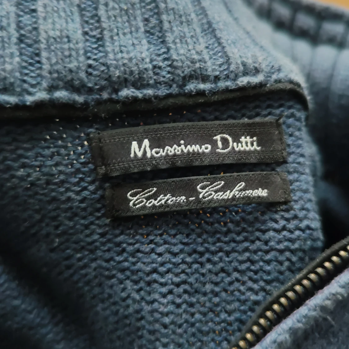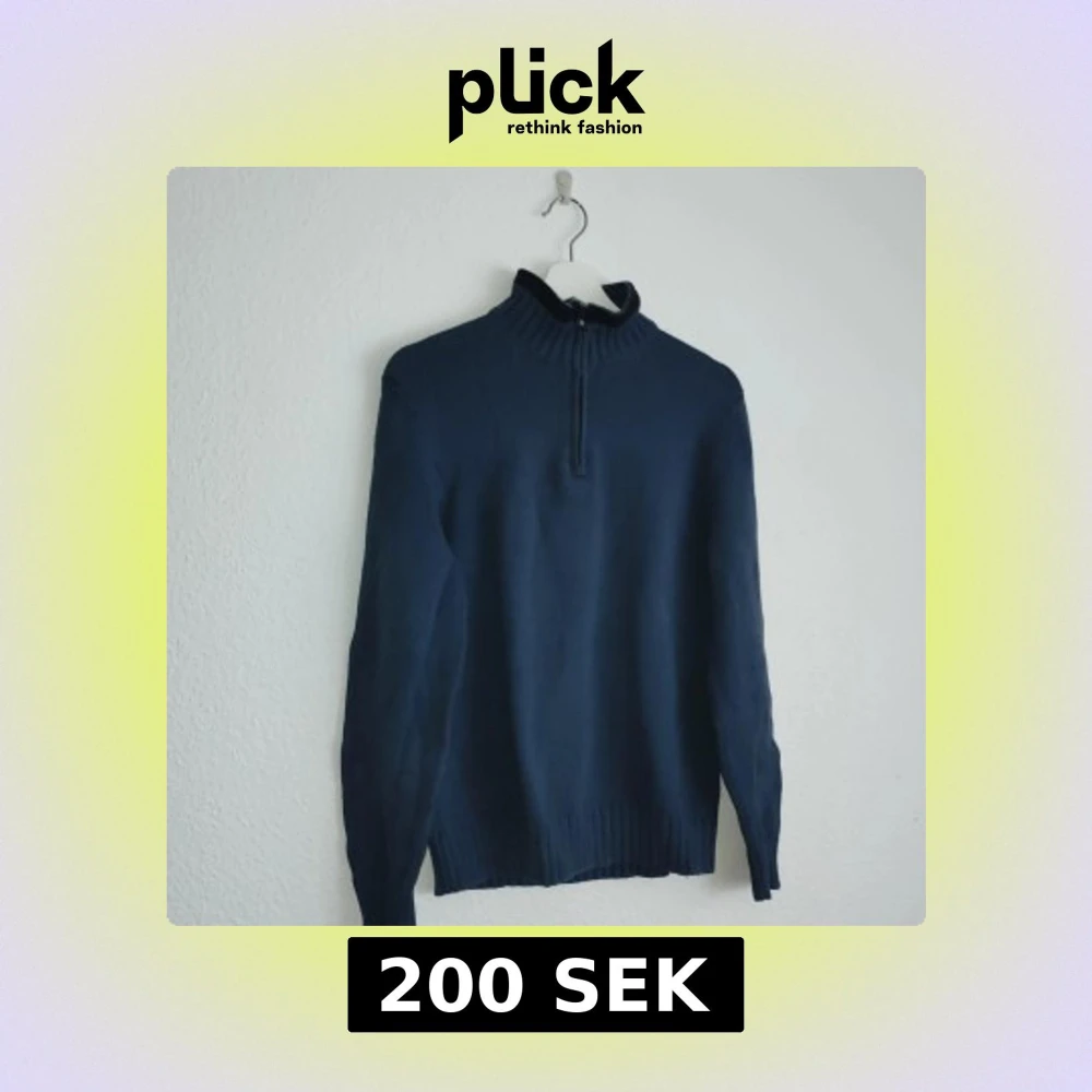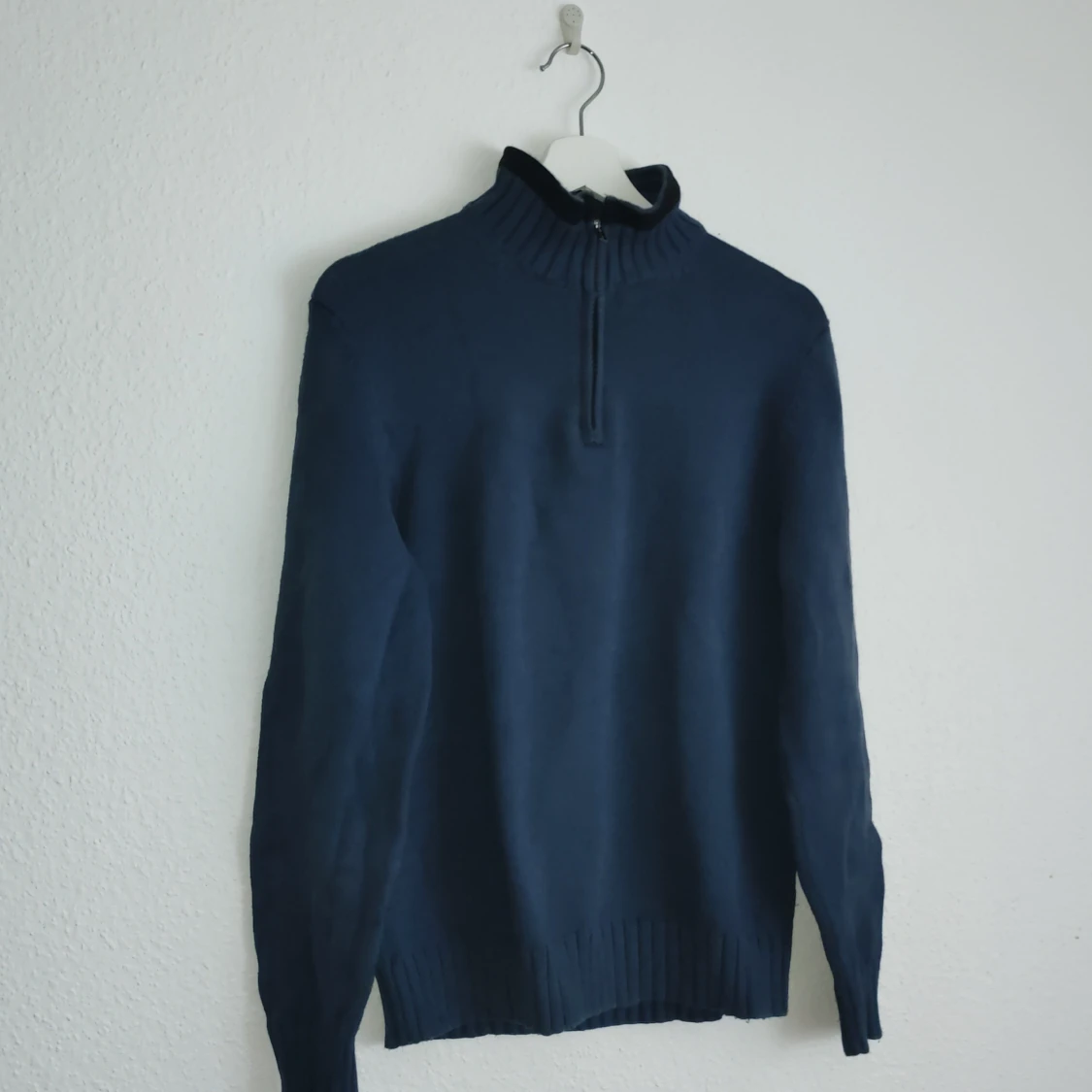 Säljer en stilren mörkblå tröja från Massimo Dutti i en mjuk blandning av bomull och kashmir. Tröjan har en hög krage med dragkedja och långa ärmar. Perfekt för kyligare dagar.