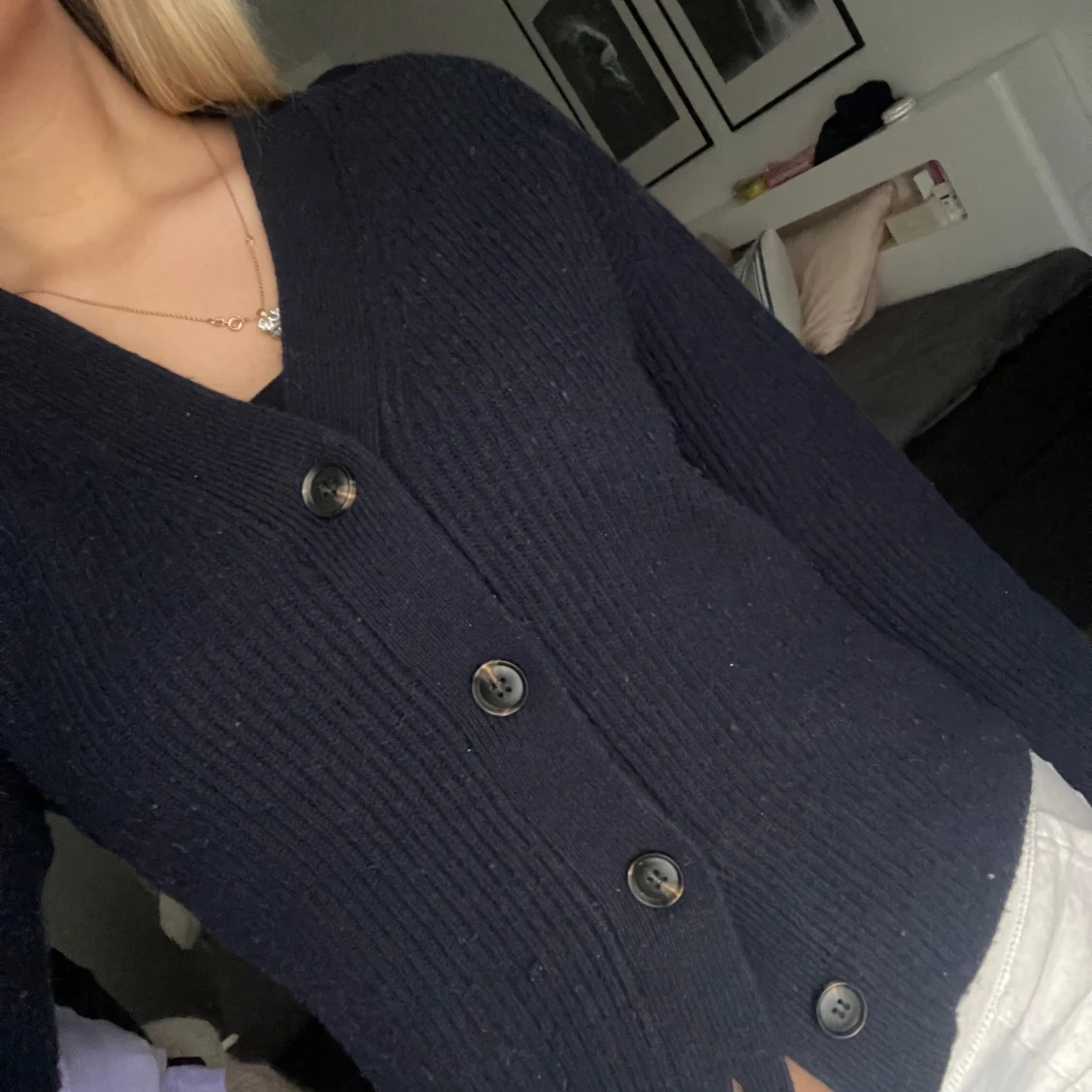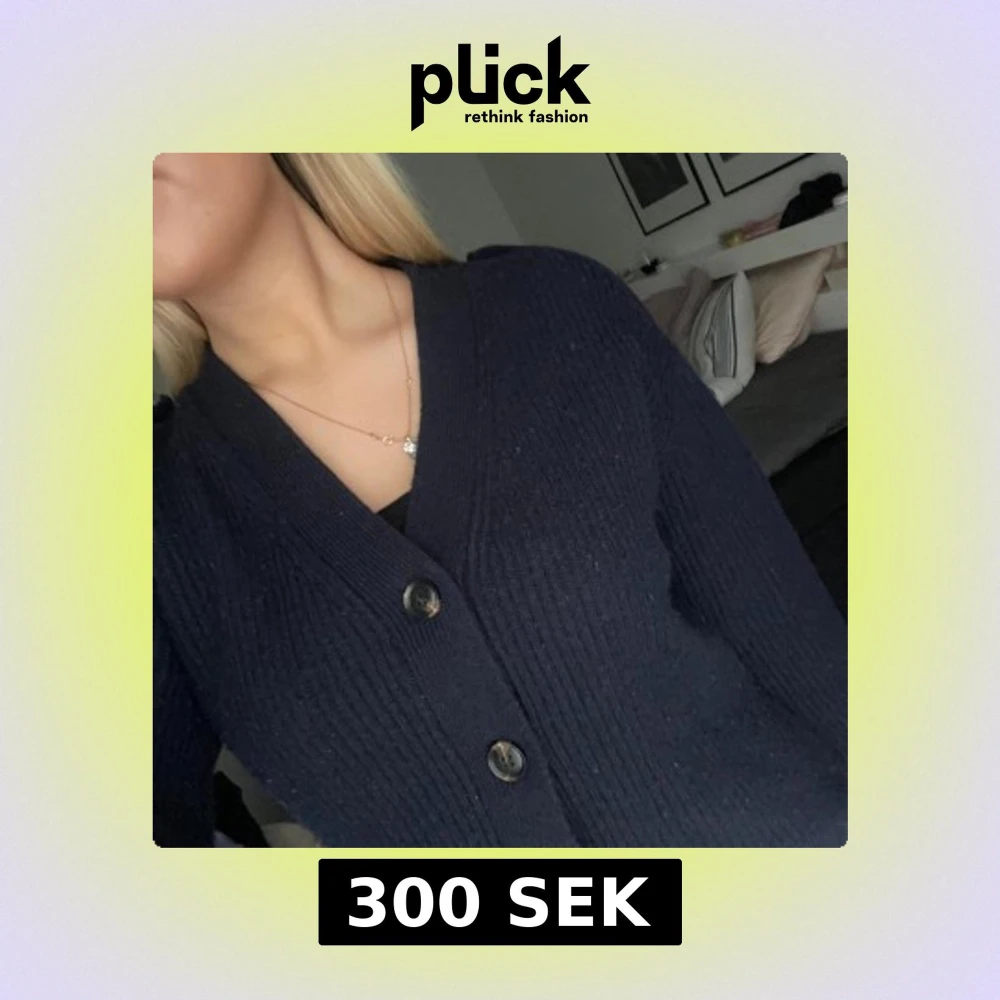 Säljer en stilren mörkblå kofta med knappar framtill. Koftan har en ribbad struktur och långa ärmar, perfekt för kyligare dagar. Passar bra till både jeans och kjol. Hör av dig vid intresse!