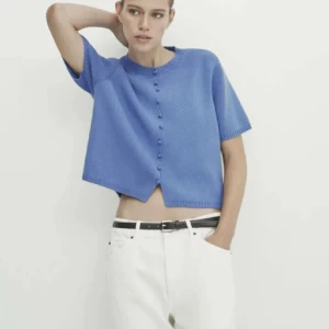 Snygg blå stickad kofta med korta ärmar och knappar framtill. Den är i superbra skick och där av priset💕tröjan har en kort passform och passar super bra till ett par jeans🥰