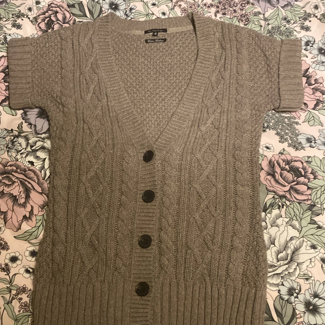 En kofta som är lång, aldrig använd men köpt second hand. Grå brun.