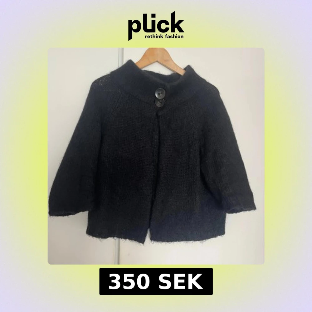 Mysig svart stickad kofta med bred krage och två stora svarta knappar framtill. Koftan har en loose passform och trekvartsärmar, perfekt för lager-på-lager under kyliga dagar. Enkel och stilren design som funkar till många outfits. Max Mara. Storlek M. Mohair material