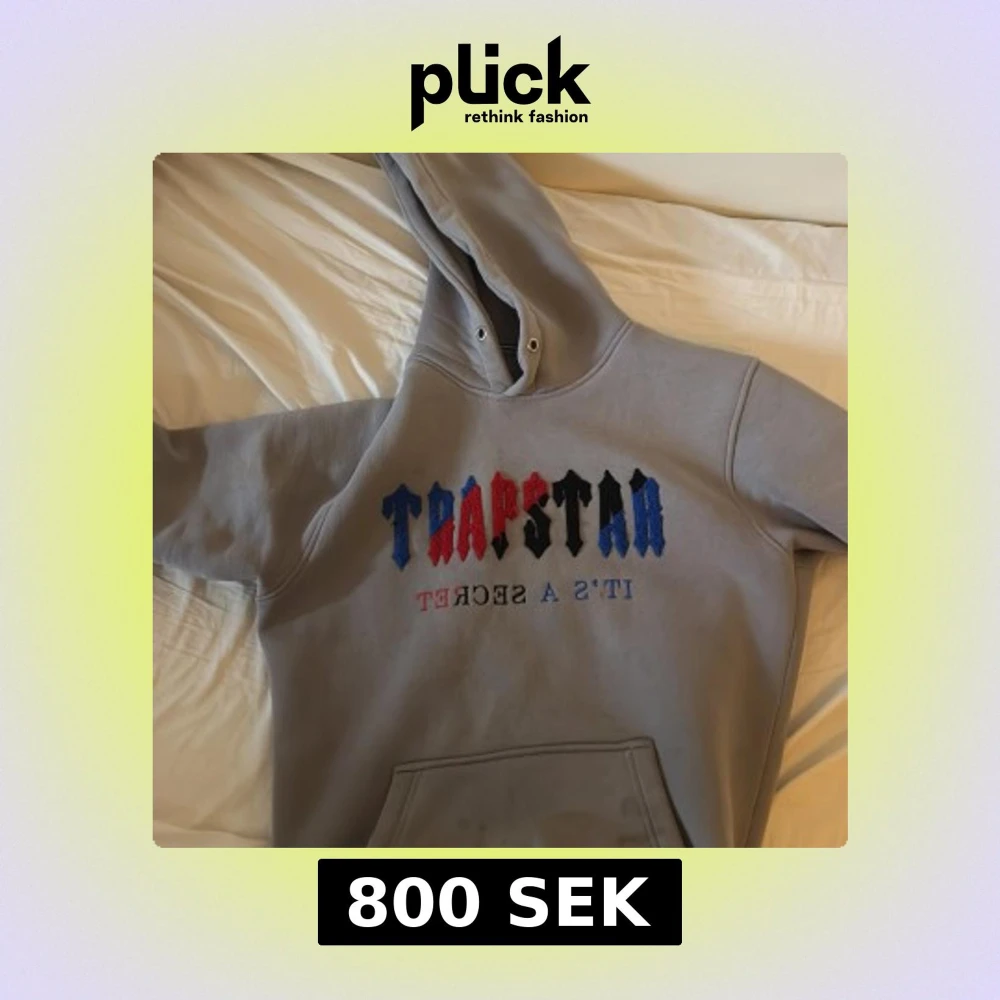 Säljer en grå hoodie från Trapstar med broderad logga i blått, rött och svart framtill samt texten 'IT'S A SECRET' i blått. Tröjan har huva och magficka, perfekt för en avslappnad stil.