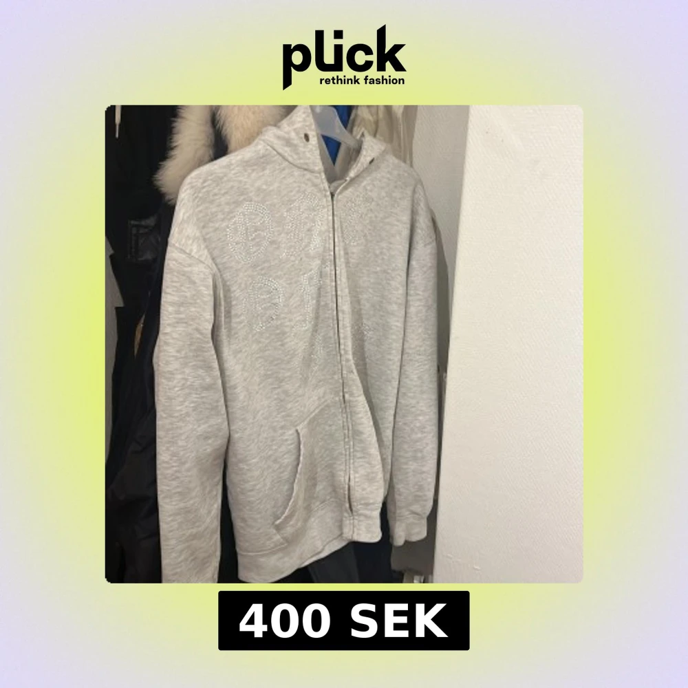 Säljer en snygg grå hoodie från One of One med glittrande strassdetaljer på framsidan. Tröjan har en dragkedja och en bekväm huva. Perfekt för en stilren och avslappnad look.
