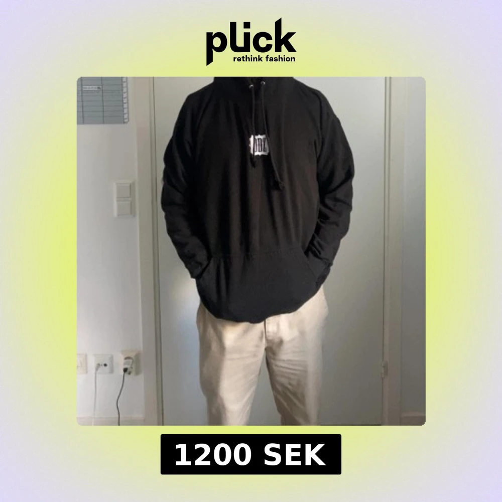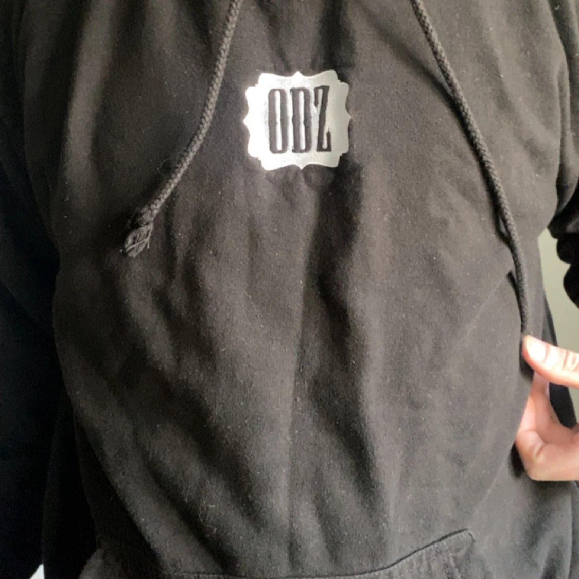 Svart hoodie från ODZ med vitt tryck på bröstet. Tröjan har huva med snörning och en stor magficka framtill. Passformen är loose och materialet känns som mjuk bomull, perfekt för chill dagar. Snygg och enkel design som funkar till streetwear.