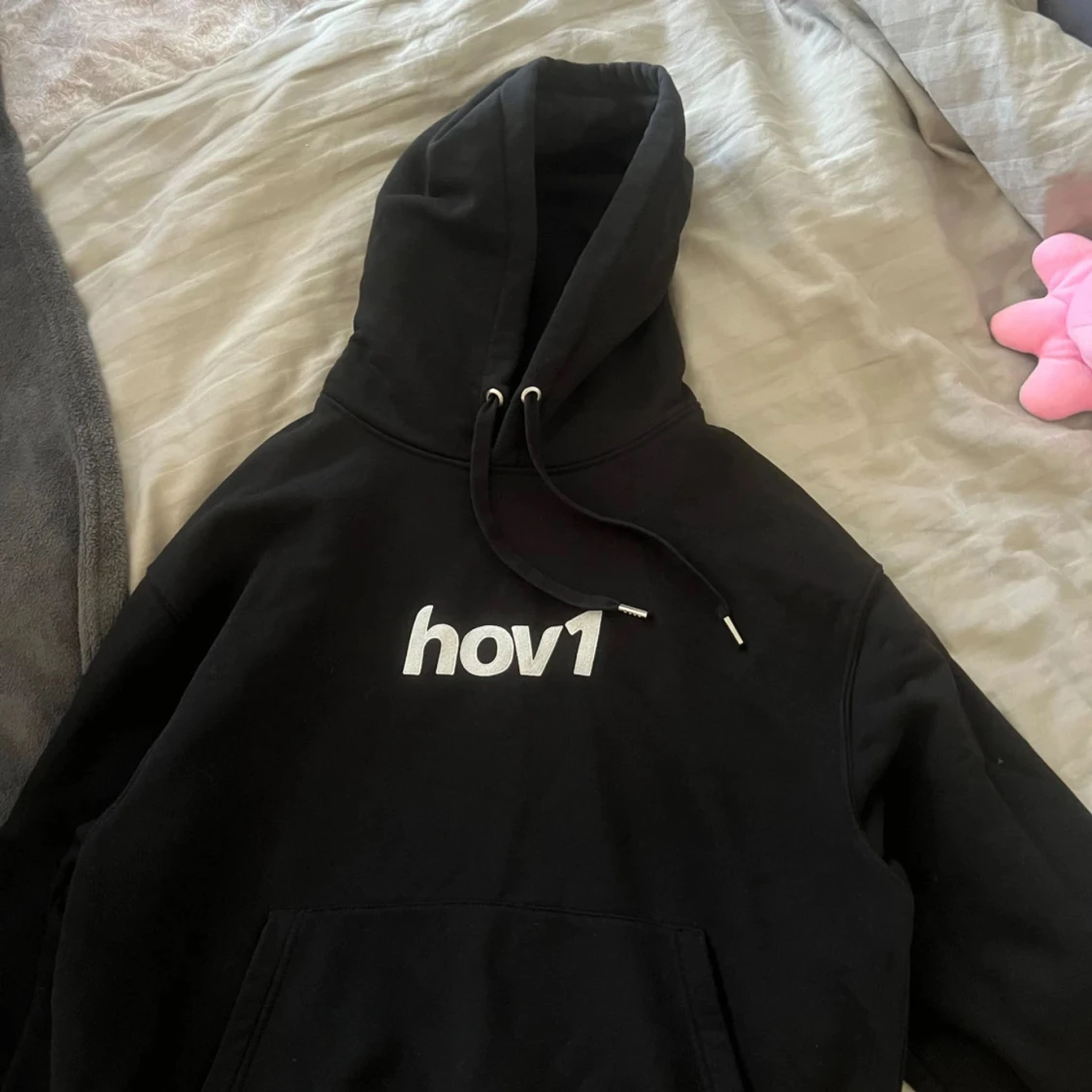 Svart hoodie från Hov1 med vit logga tryckt på bröstet. Klassisk modell med huva, snörning och känguruficka framtill. Perfekt för dig som gillar streetwear och vill visa ditt stöd för bandet.