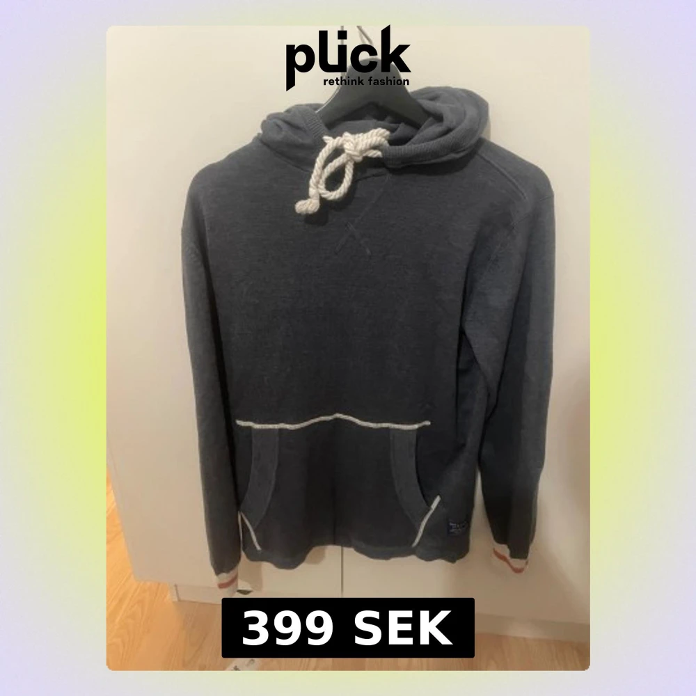 Säljer en mörkblå hoodie från Jack & Jones med vit snörning i huvan och vita detaljer vid fickorna. Tröjan har långärmade ärmar med orange patch på armbågarna och randiga muddar i vitt och orange.