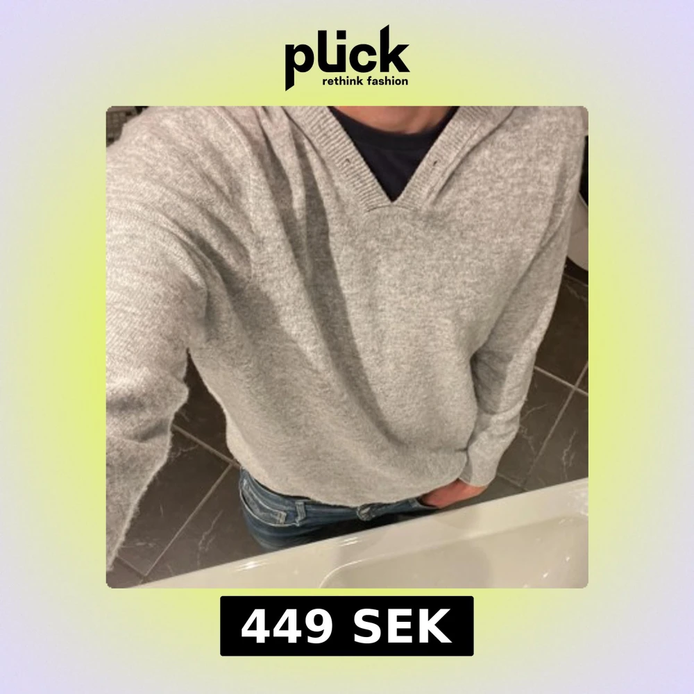Mysig grå stickad hoodie med v-ringning och huva. Tröjan har lång ärm och ribbade muddar vid ärmslut och nederkant. Perfekt för kyliga dagar och enkel att matcha med jeans eller andra byxor.
