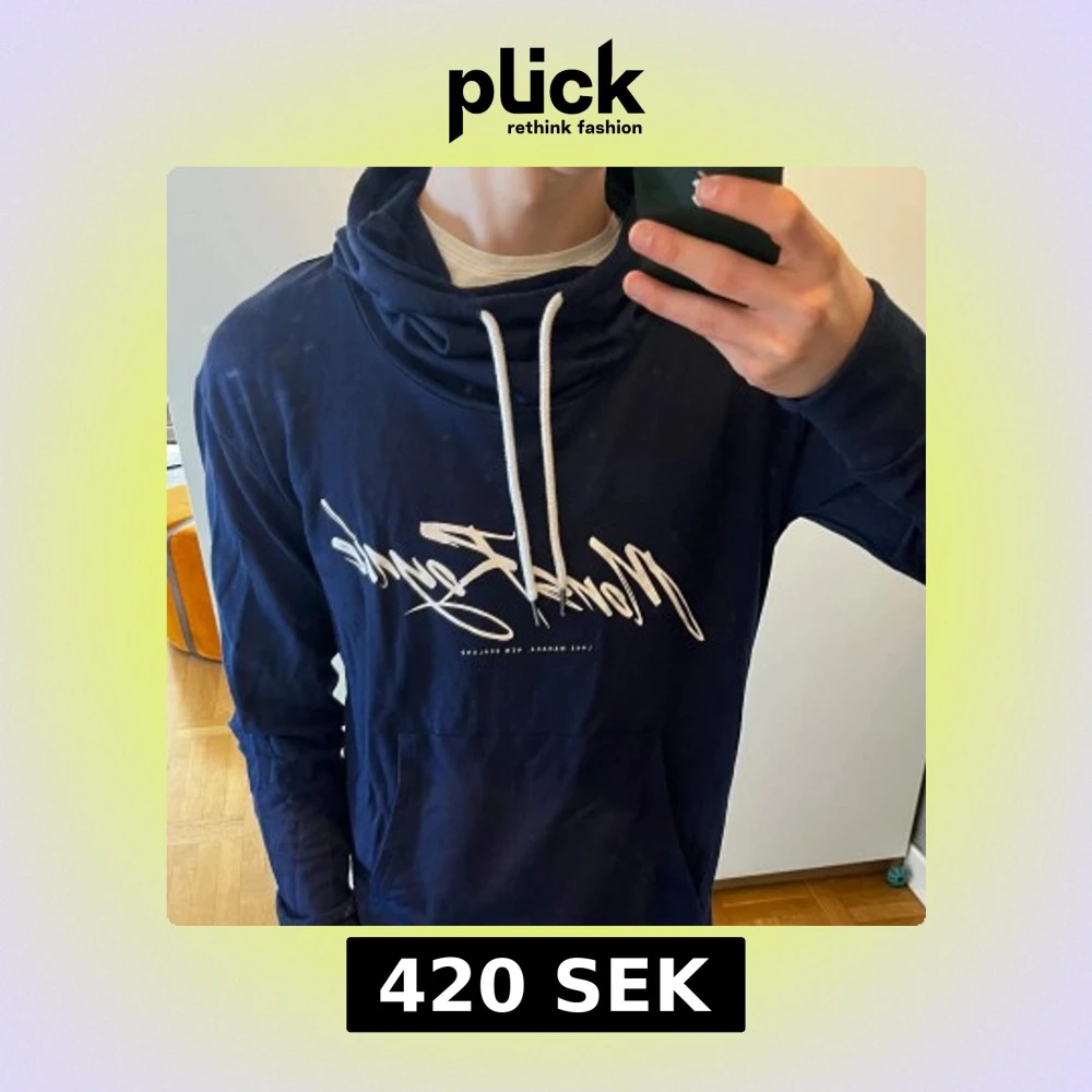 Säljer en snygg mörkblå hoodie från Mons Royale med vitt tryck på framsidan. Tröjan har en justerbar huva med vita snören och en stor ficka framtill. Perfekt för en avslappnad stil. Tröjan är i 91% merino. Skicket är utmärkt och inge defekter eller liknande förekommer.