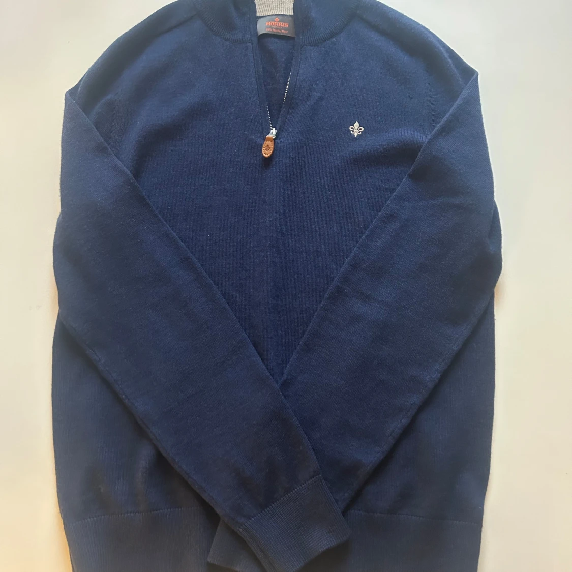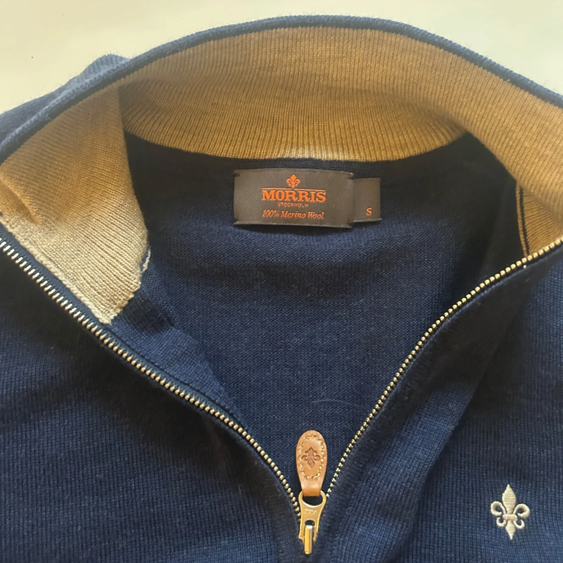 Snygg mörkblå tröja från Morris i merinoull med dragkedja. Perfekt nu till våren. En stilren och bekväm tröja för alla tillfällen. En liten skavank som är ihop sydd på insidan men syns knappt på utsidan. Nypris på denna är runt 2000 säljer för 450