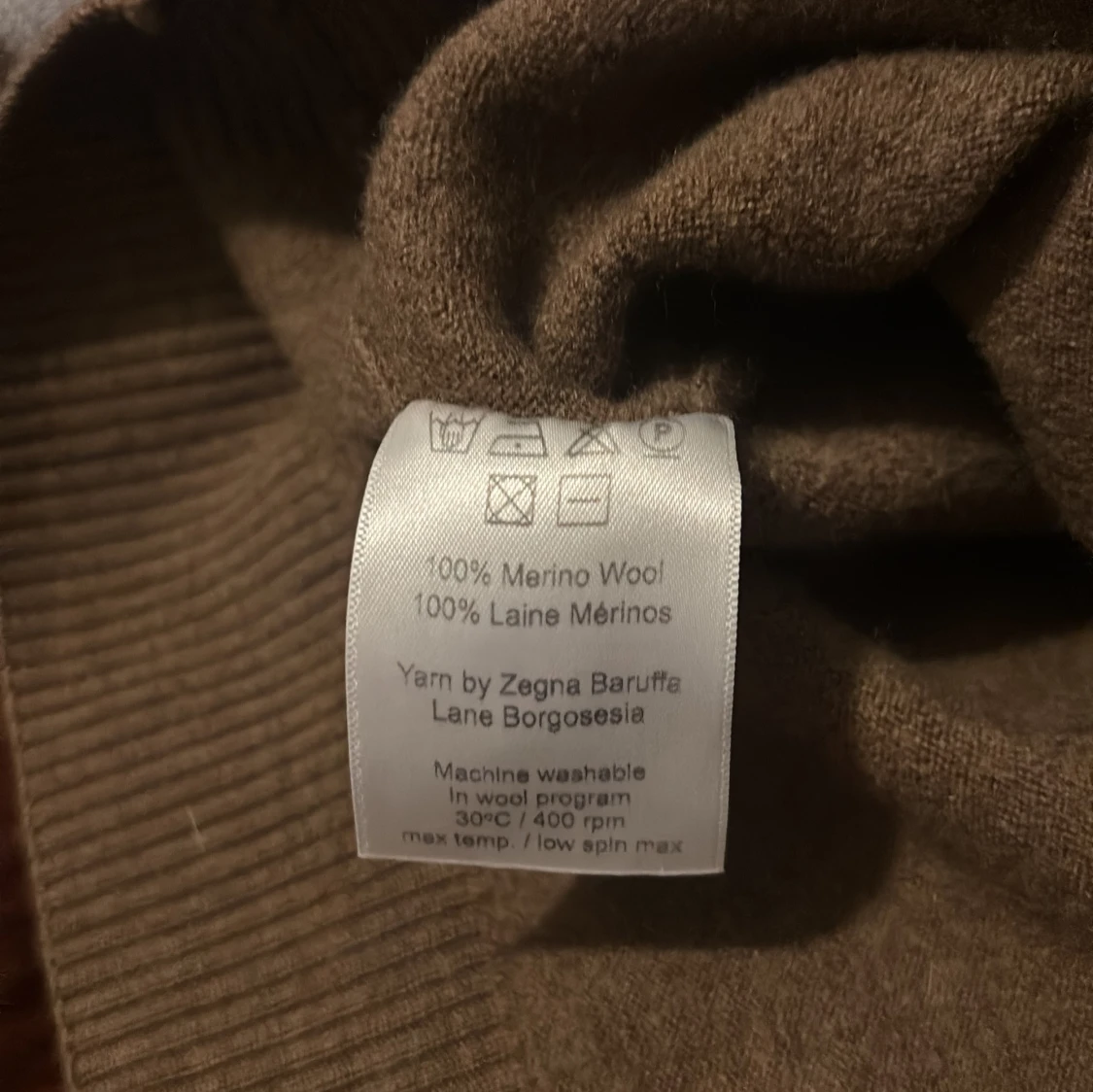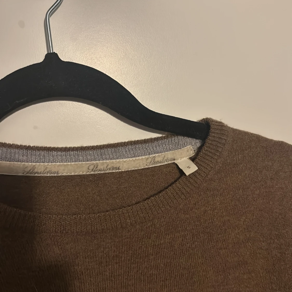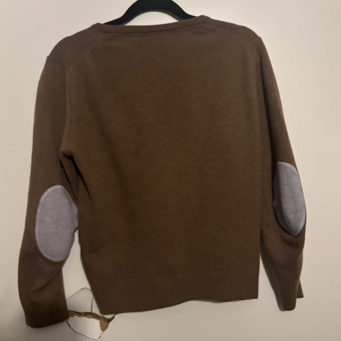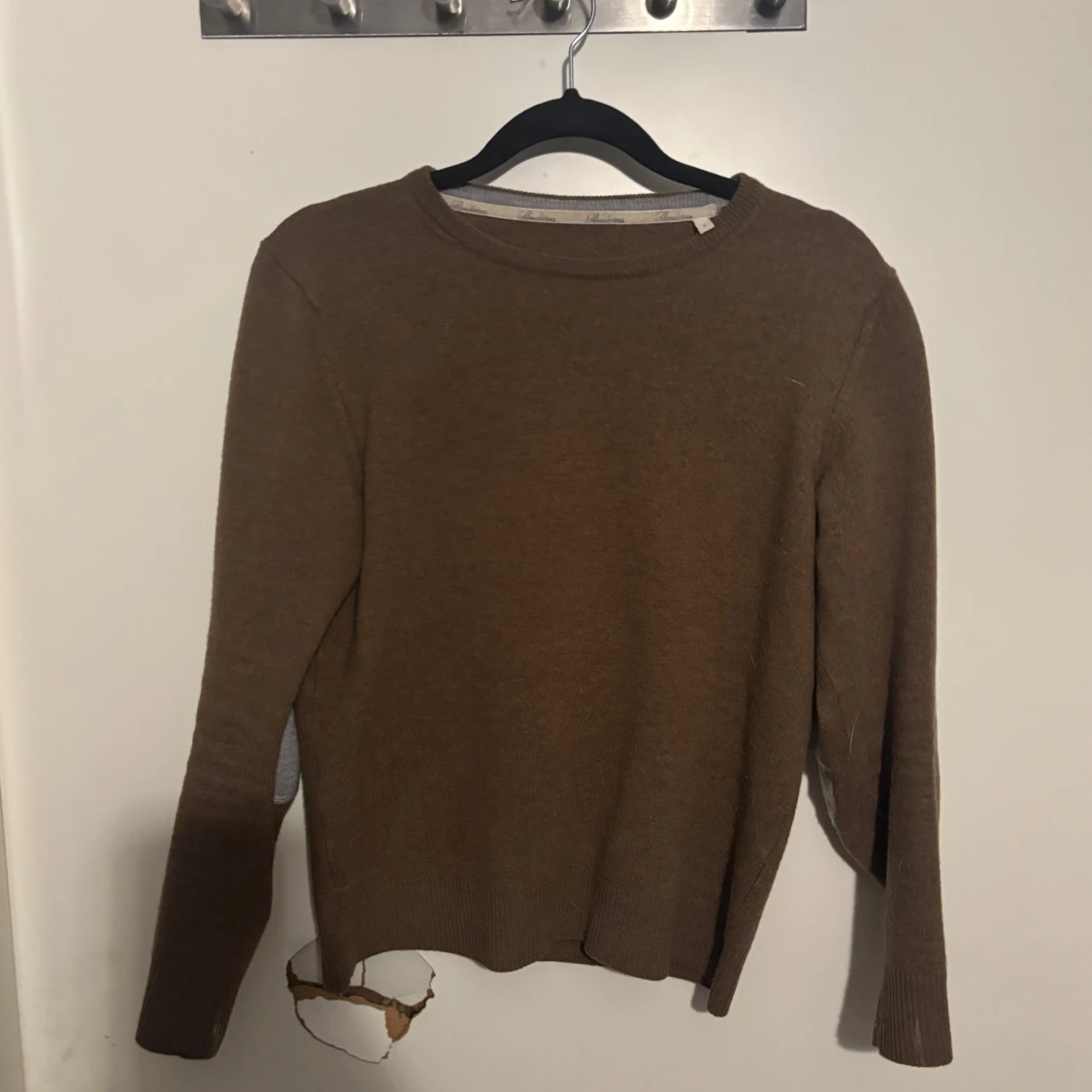 Säljer en stilren brun tröja i 100% merinoull med grå armbågslappar. Tröjan har storlek s men sitter som xs. Nypris 2000kr mitt pris 499.