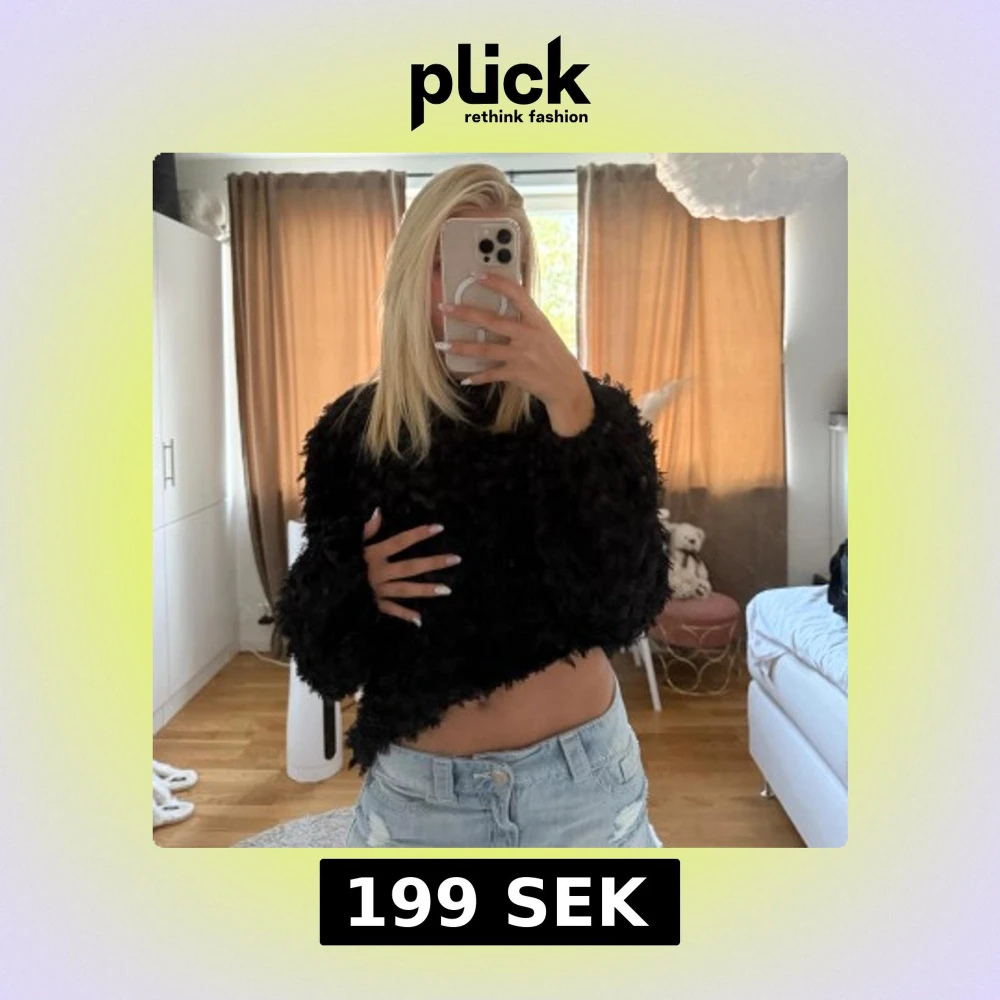 Säljer en svart fluffig stickad tröja med lång ärm och rund hals. Tröjan har en cool, lite oversized passform och är supermjuk med en unik textur som ger en trendig look. Perfekt att styla med jeans eller kjol för en chill vibe.