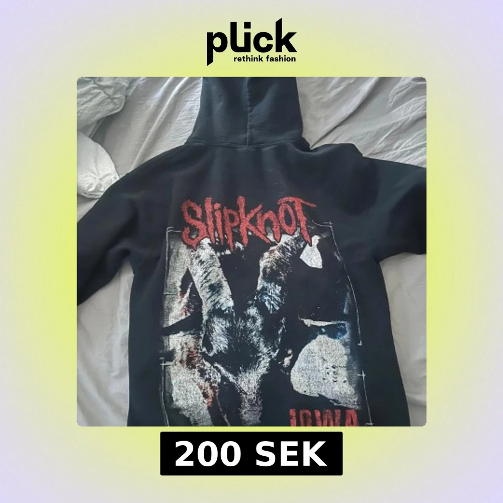 Svart hoodie med Slipknot-tryck både fram och bak. Framsidan har rött Slipknot-logo och texten '2001 IOWA 2016' med grafiskt mönster. Baksidan har stort tryck med bandets logga och motiv från albumet Iowa. Klassisk känguruficka och huva.