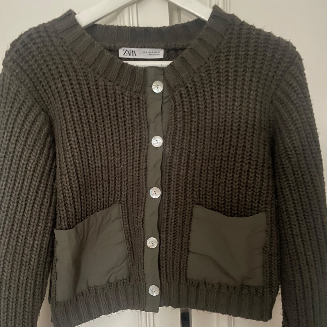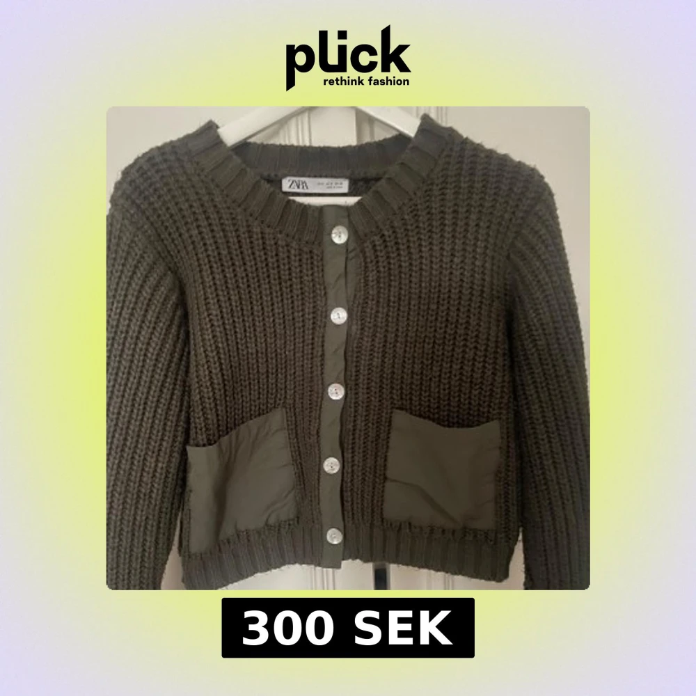 Säljer en olivgrön stickad kofta från Zara med knappar framtill och två praktiska fickor. Koftan har en ribbad struktur och långa ärmar, perfekt för kyligare dagar. En stilren och bekväm tröja för alla tillfällen.