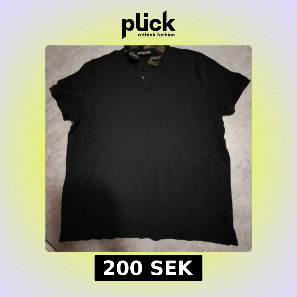Svart pikétröja från Michael Kors i storlek XL. Klassisk modell med korta ärmar och knäppning framtill. Kragen har ett snyggt camouflage-mönster som ger en cool kontrast till den svarta basen. Perfekt för dig som gillar stilrena plagg med en twist.