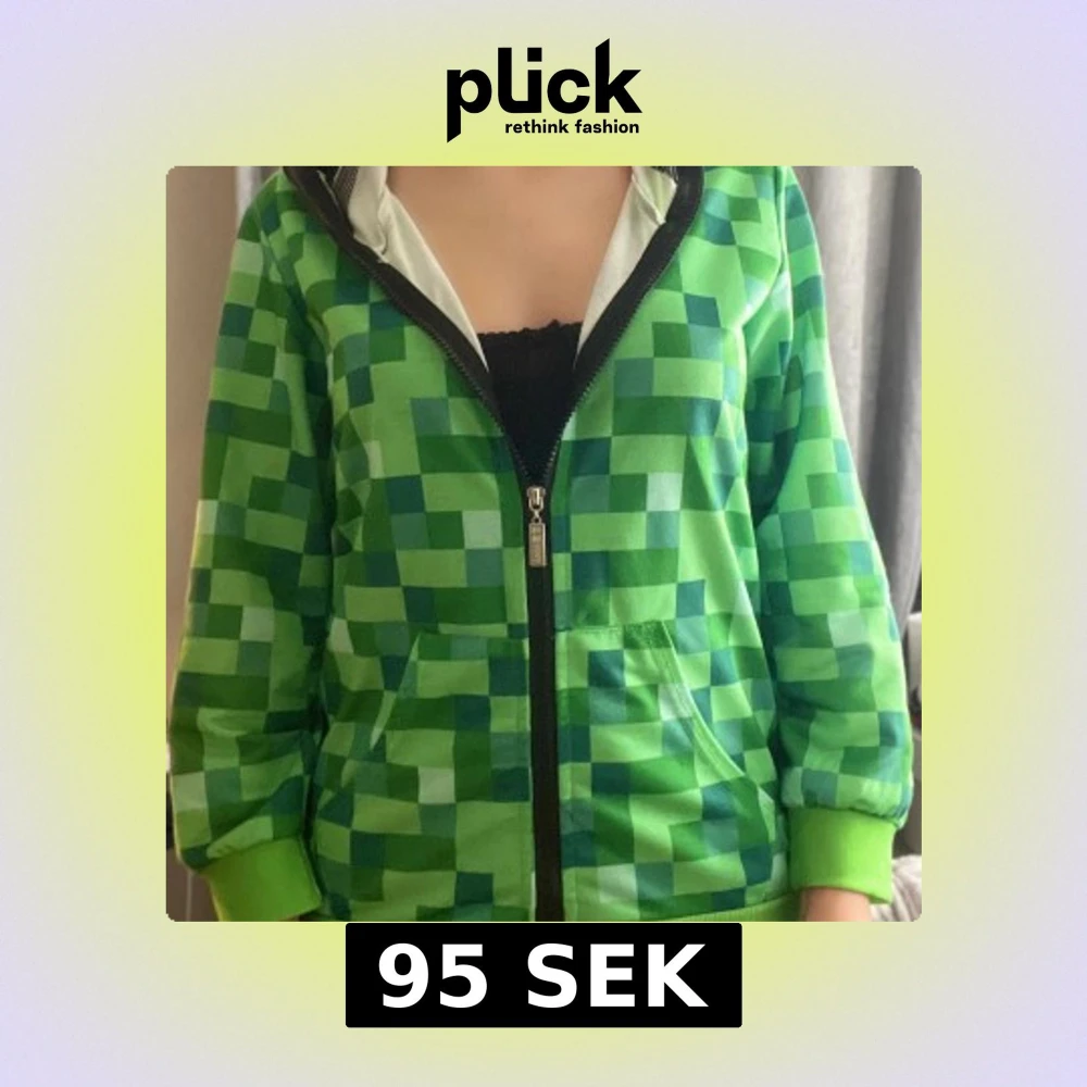 Säljer en grön hoodie med pixelmönster i olika gröna nyanser, inspirerad av Minecraft. Tröjan har huva, dragkedja framtill och två fickor. Perfekt för dig som gillar gaming och vill sticka ut med en färgglad stil.