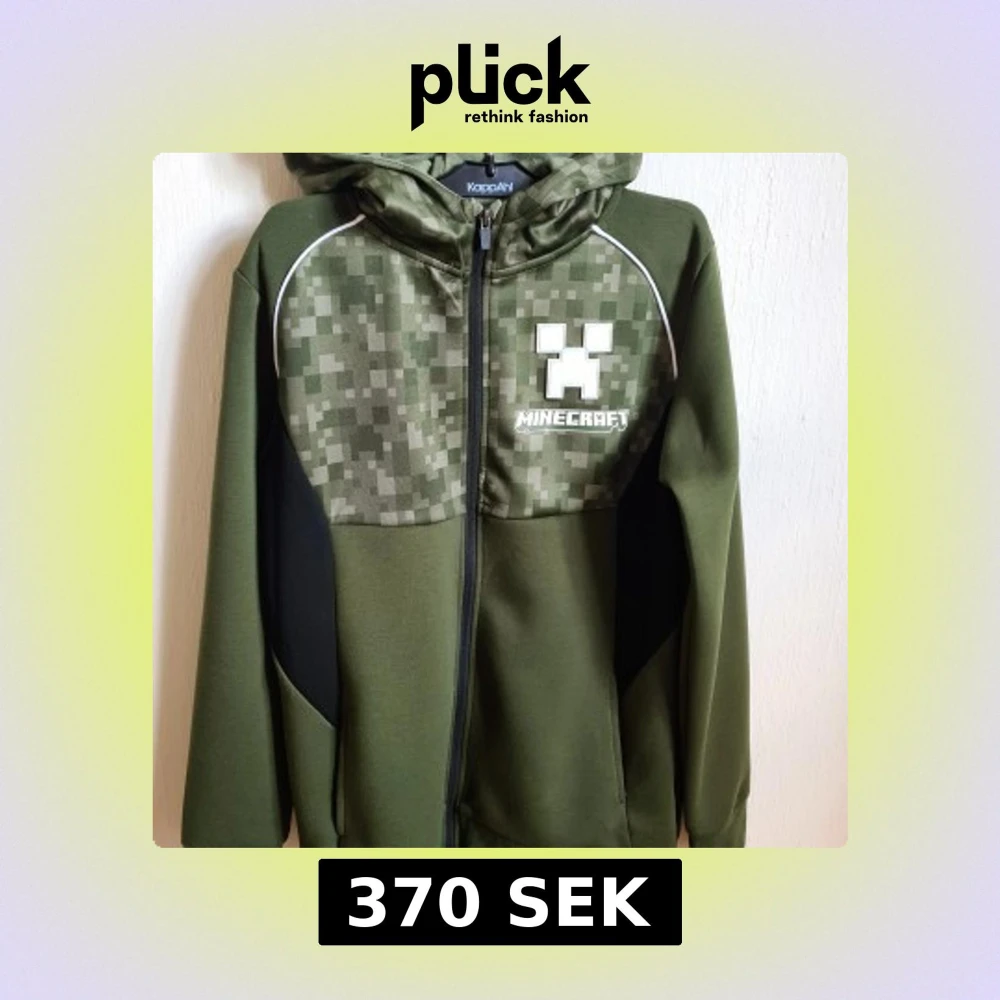 Grön Minecraft hoodie med digitalt camomönster på bröst och huva. Tryckt Creeper-logga och texten 'GAME ON! ADVENTURE MODE' på ryggen. Långärmad med dragkedja och huva, perfekt för gamingfans.