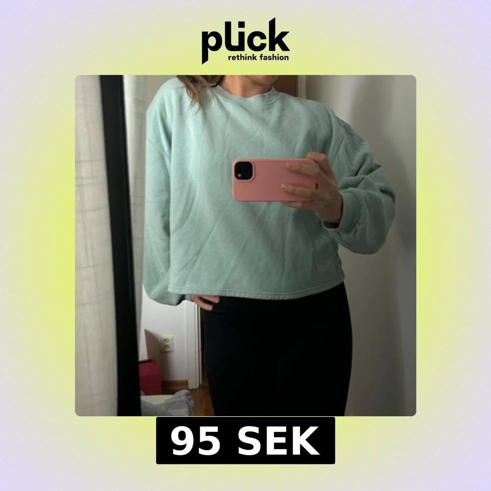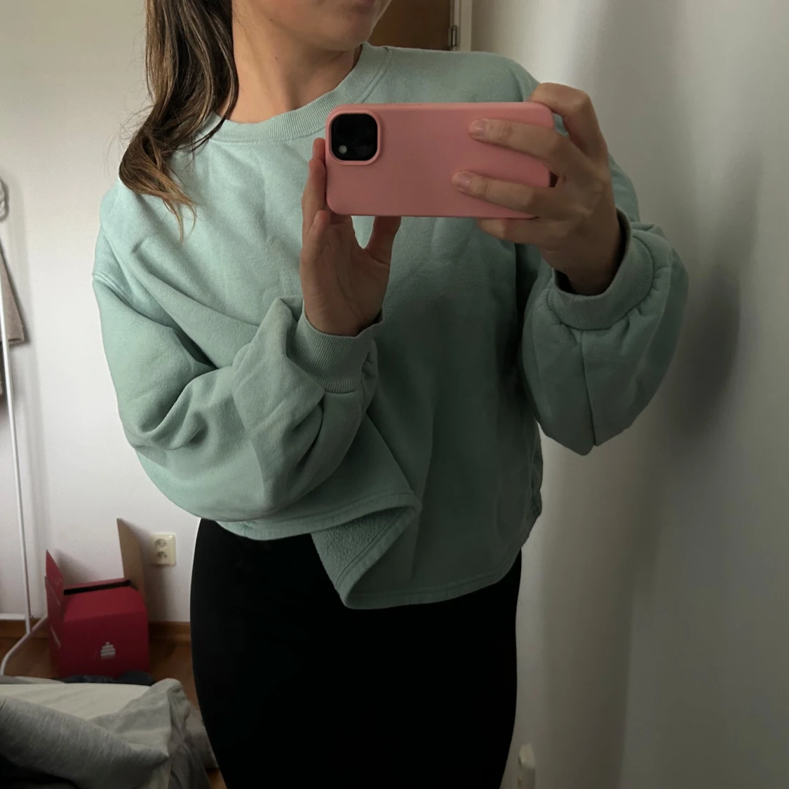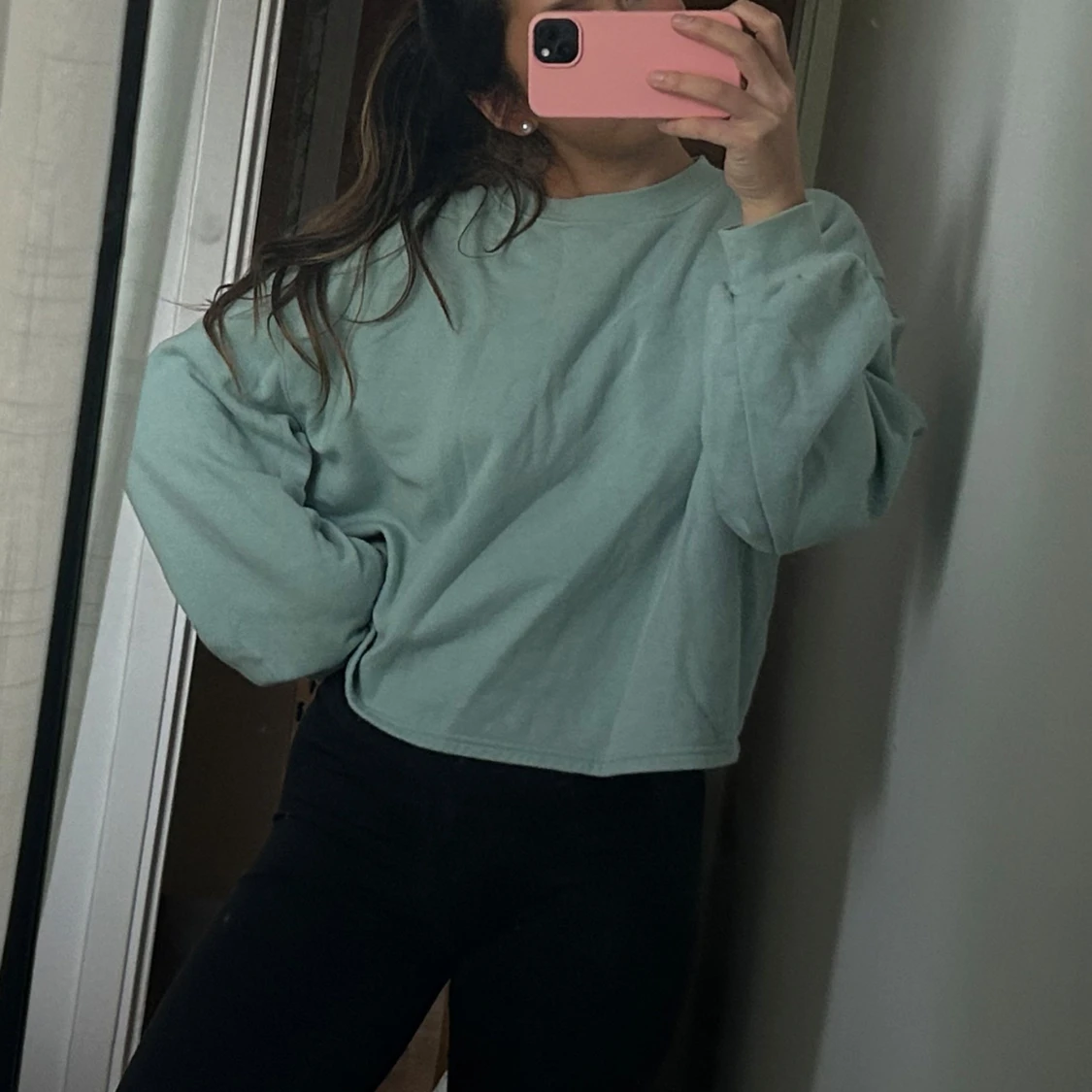 Säljer en mintgrön croppad sweatshirt med rund hals och långa ärmar. Tröjan har en avslappnad passform och är tillverkad i mjukt bomullsmaterial. Perfekt för en chill och stilren look.