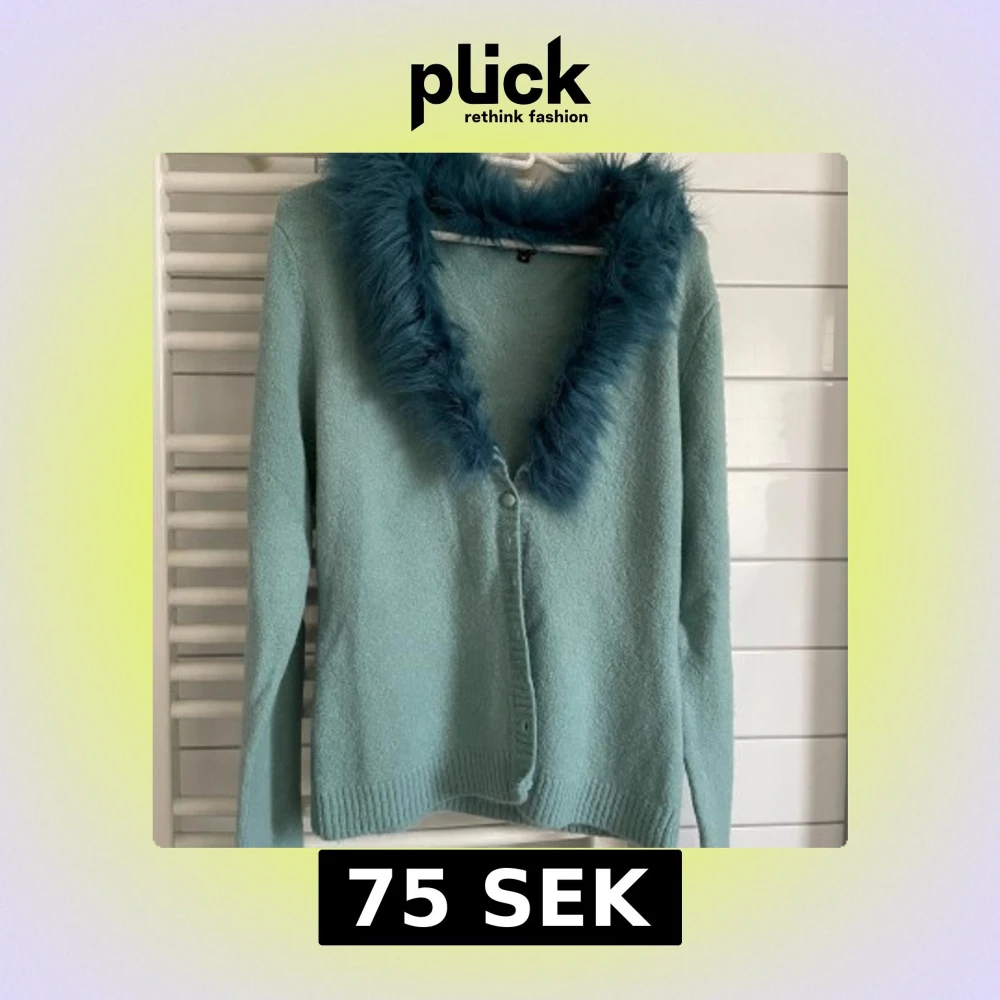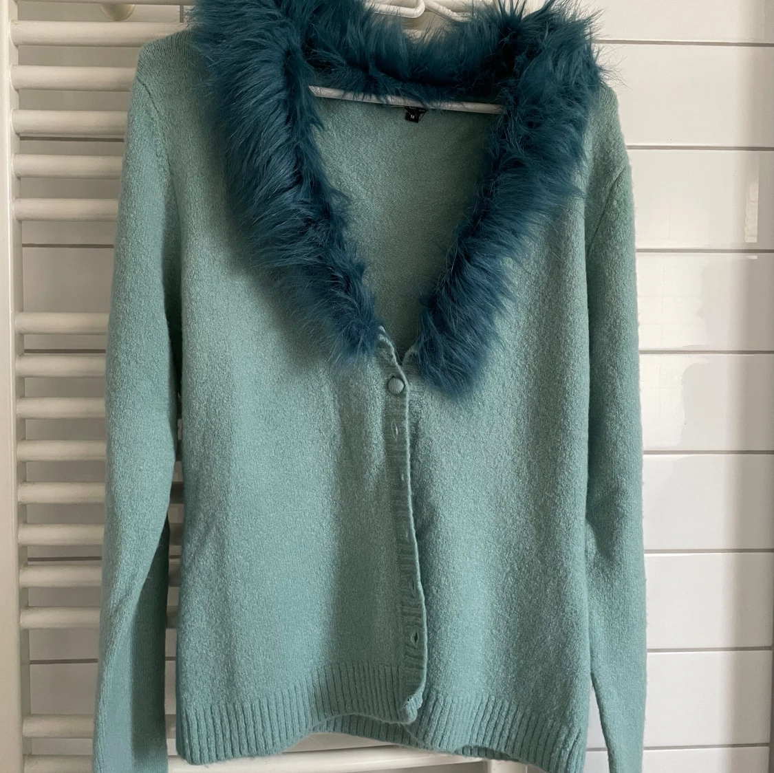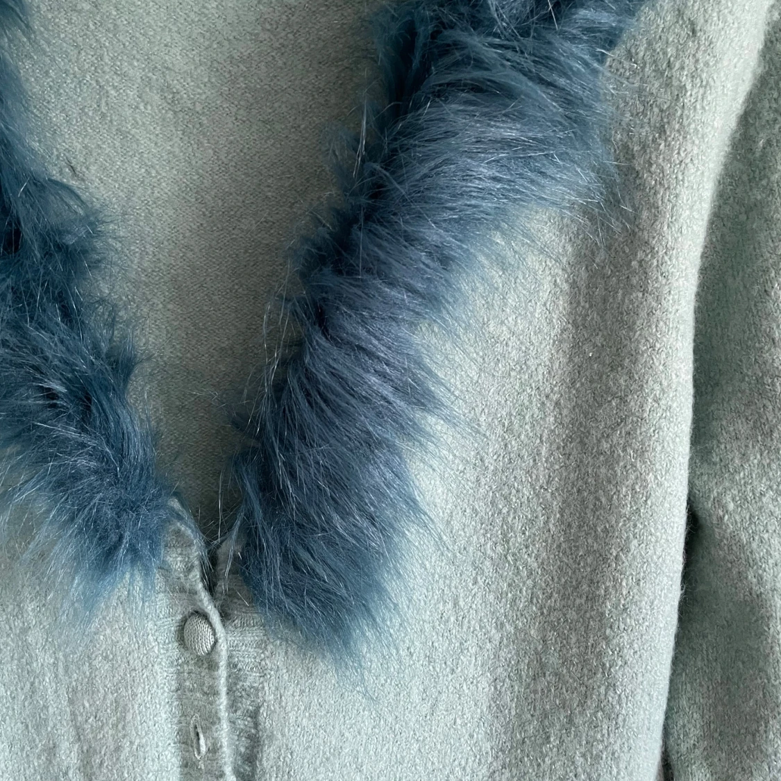Säljer en mintgrön kofta med fluffig blå päls runt kragen. Koftan har långa ärmar, ribbade muddar och knappar framtill.
