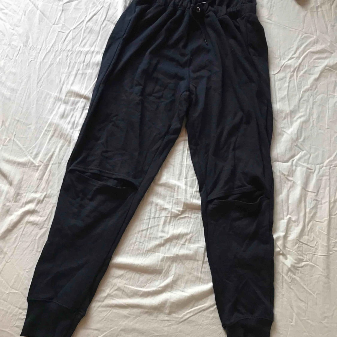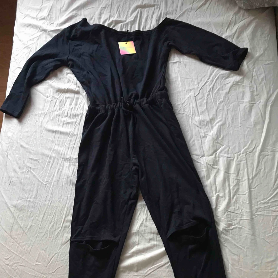 En helt ny mörkblå jumpsuit från Missgiuded i mjukismaterial. Har snöre vidmidjan och hål i käna samt off shoulder. Perfekta mys-setet. Om man är lång skulle jag säga att de passar till någon i M annars en liten L. Nypris kanske låg på 350-450kr