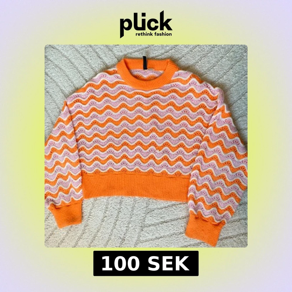Superfin stickad tröja i orange och ljusrosa med vågigt mönster. Tröjan har ribbade muddar och är croppad i modellen. Perfekt för att sticka ut lite med färg och mönster! 💕