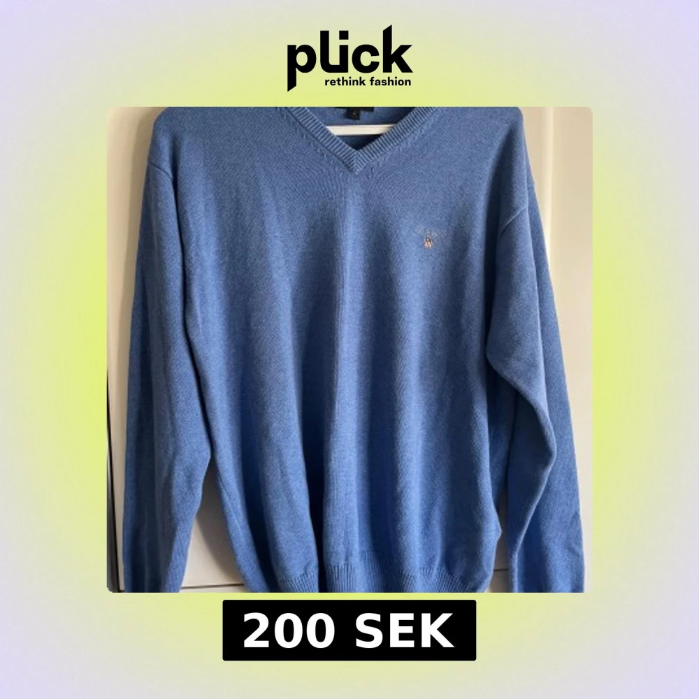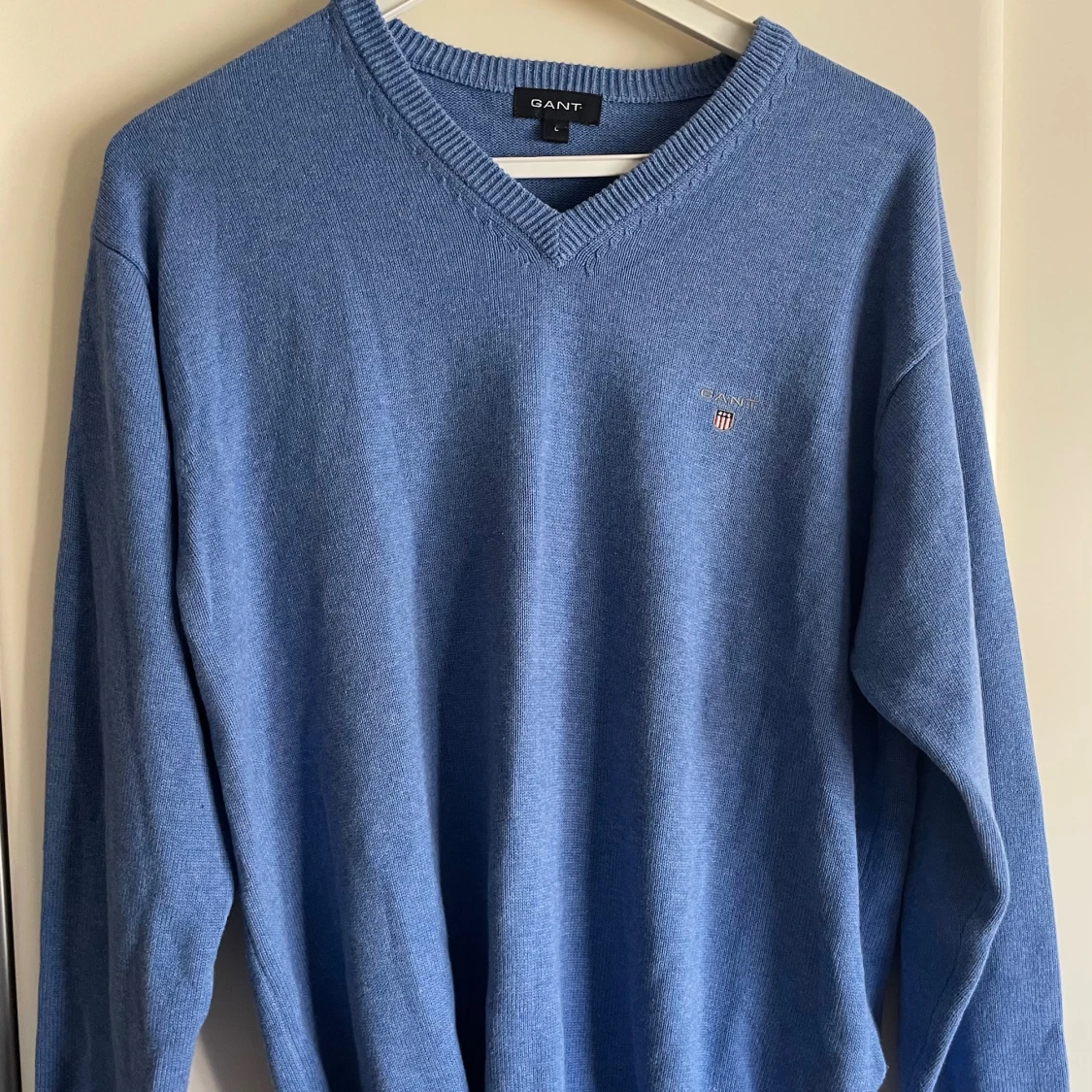 Säljer en klassisk blå v-ringad tröja från GANT med broderad logga på bröstet. Tröjan är långärmad och har ribbade muddar vid ärmslut och nederkant. Perfekt för lager-på-lager och enkel att matcha med jeans eller chinos. Stl L