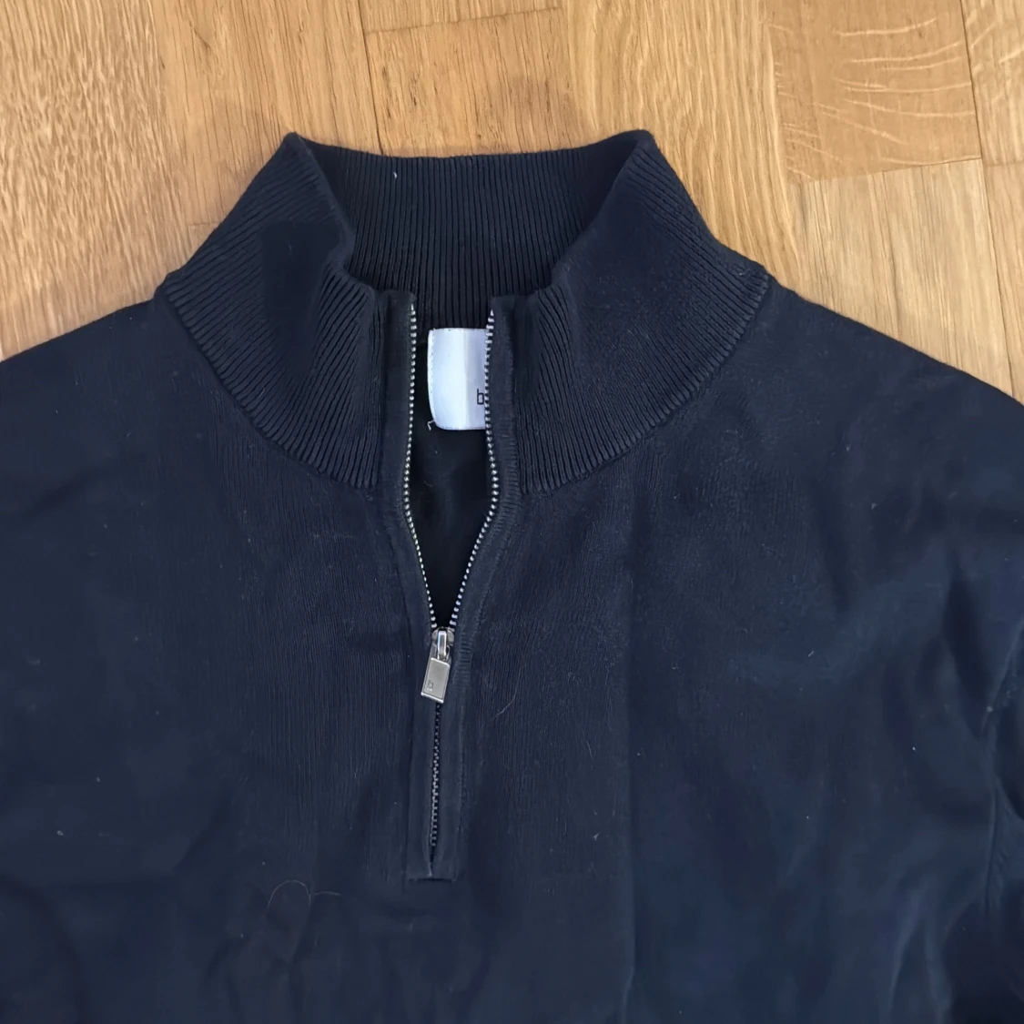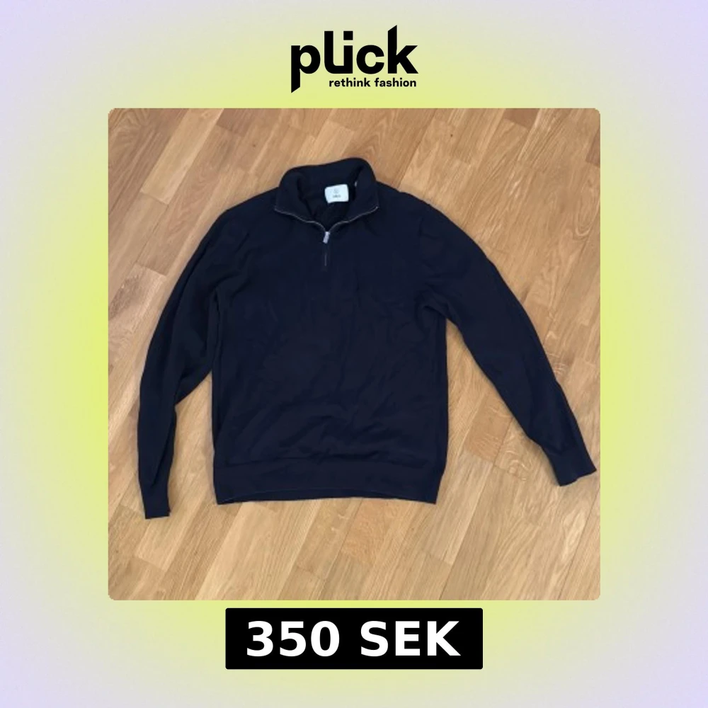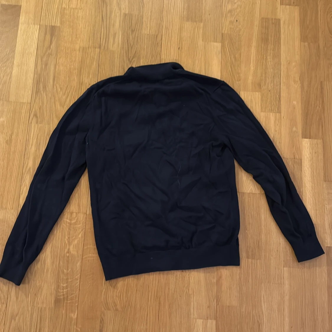 Mörkblå långärmad tröja från Bläck med ribbad krage och half zip-dragkedja. Tröjan har en clean look och är gjord i mjukt bomullsmaterial, perfekt för lager-på-lager under kyliga dagar. Storlek S, säljer då den inte passar mig längre.
