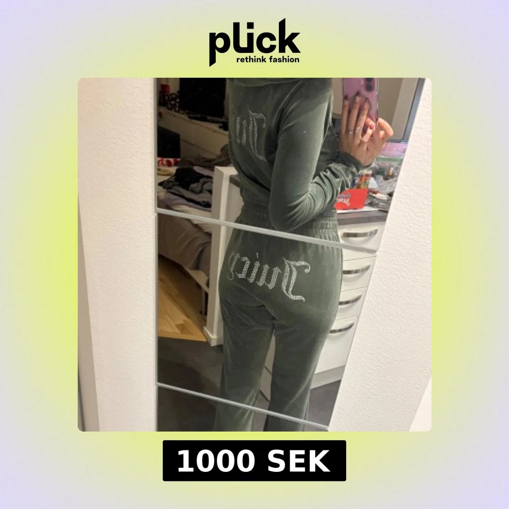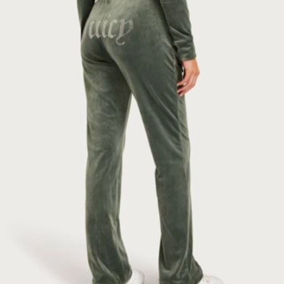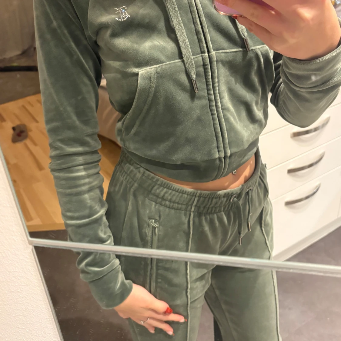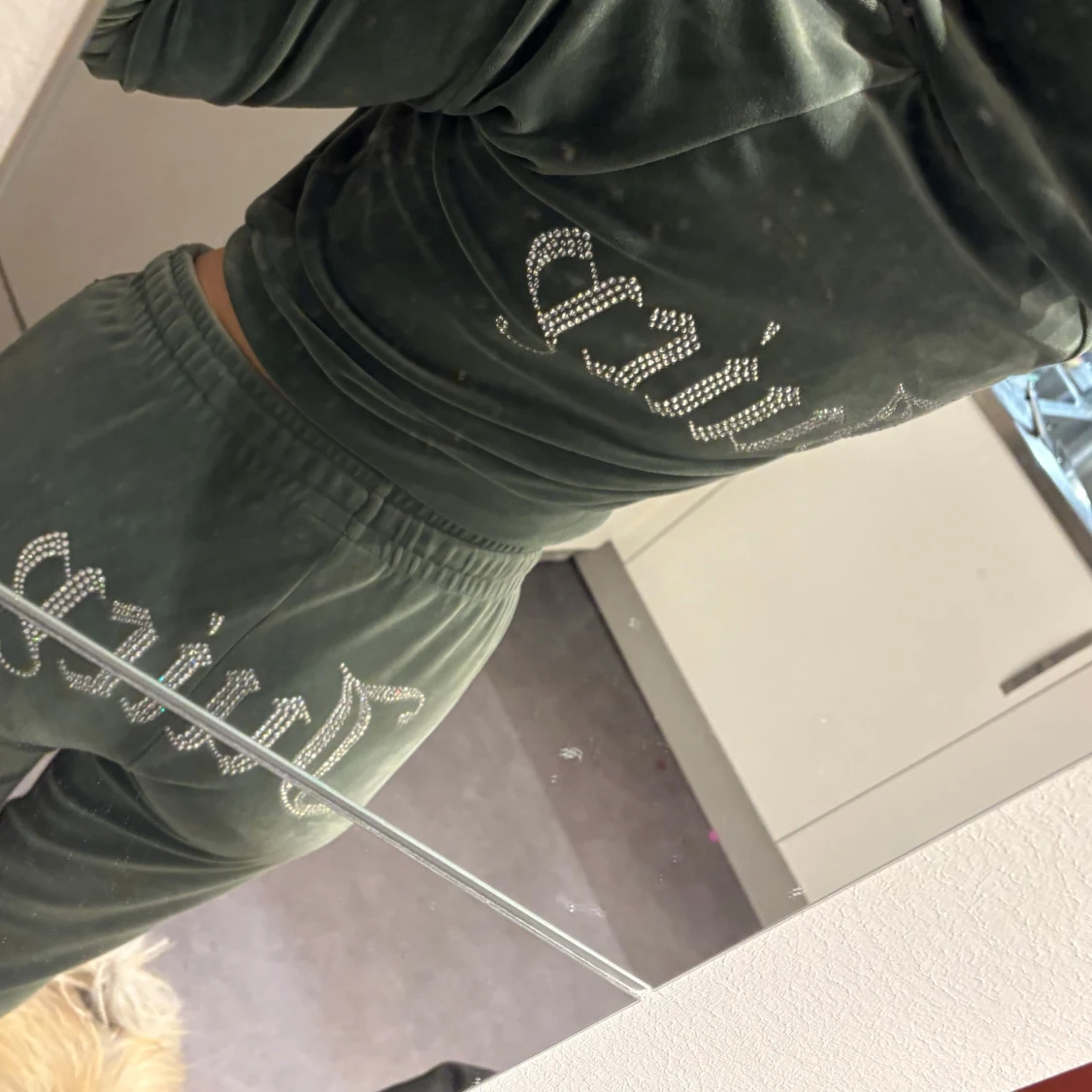 Snyggt grönt set från Juicy Couture med dragkedja och huva. Tröjan har långa ärmar och ett glittrigt Juicy-tryck på ryggen. Perfekt för en avslappnad och trendig look xs i tröjan och s i byxorna .