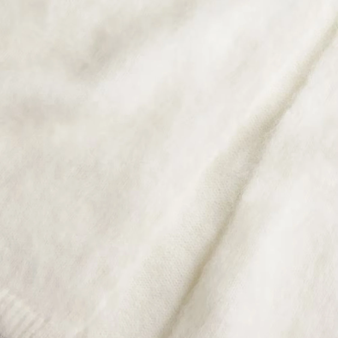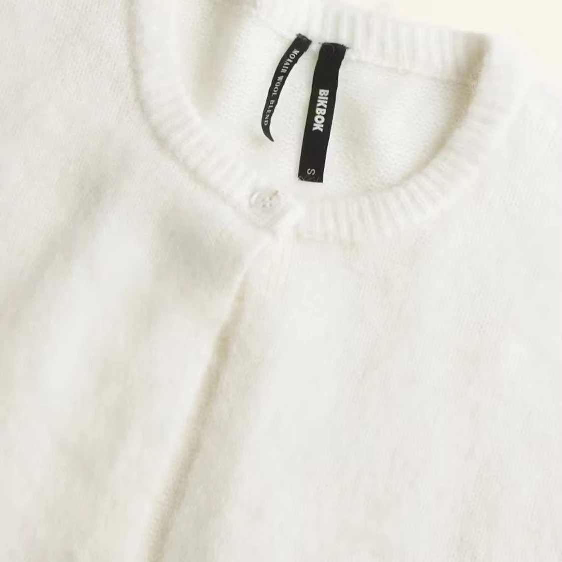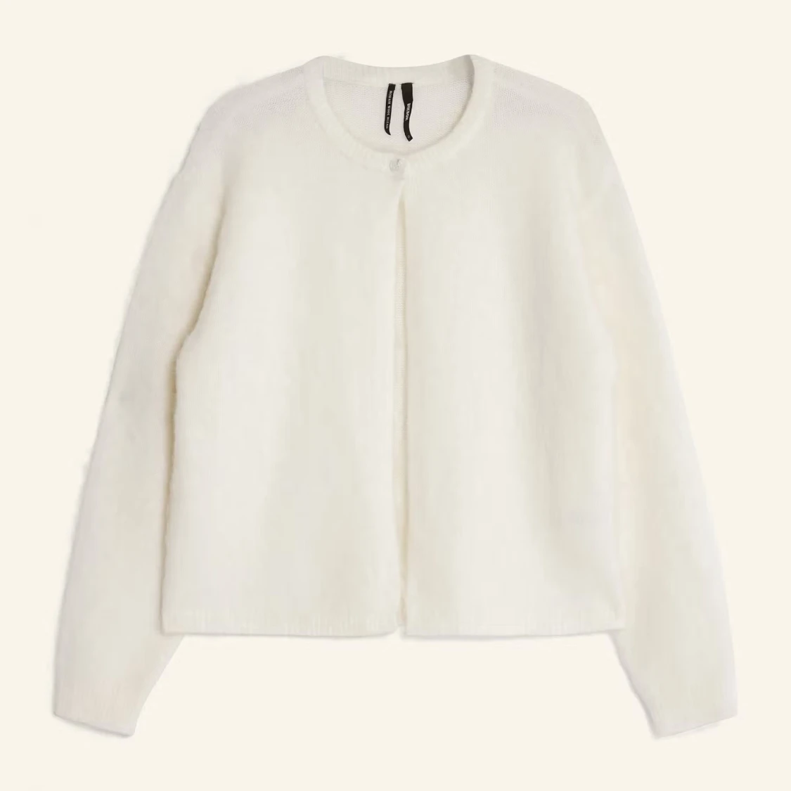 Helt ny med lapp kvar, finns fortfarande i butik för 700kr. Storlek L men känns mer som M. Jättegullig och fluffig vit kofta mohair- och ullblandning. Rund halsringning, längärmad och stängs med en knapp upptill.