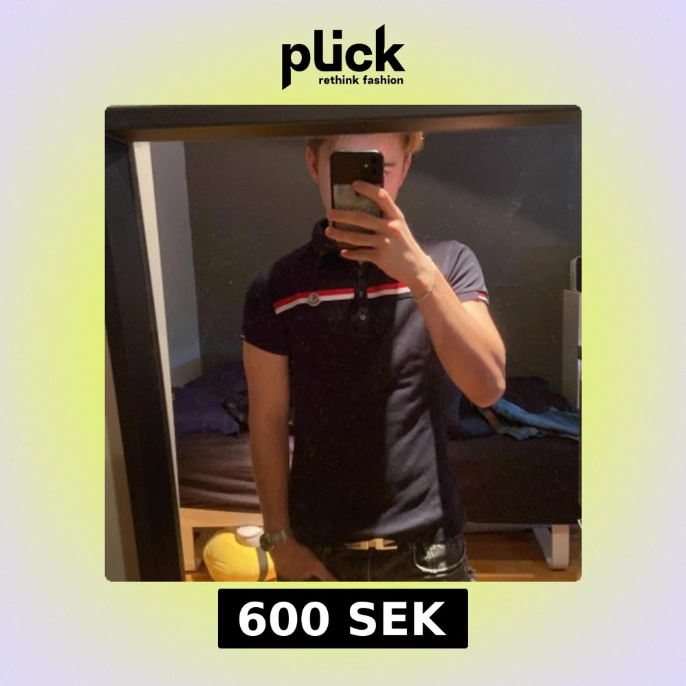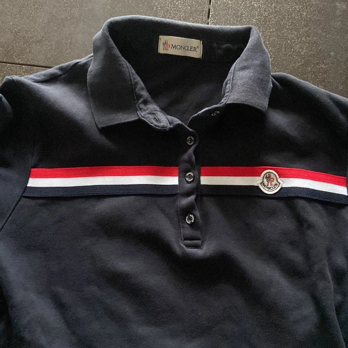 Säljer en stilren mörkblå pikétröja från Moncler med en unik design med röd och vit randdetalj över bröstet. Tröjan har korta ärmar och en klassisk krage med knappar. Perfekt för en avslappnad men snygg look.