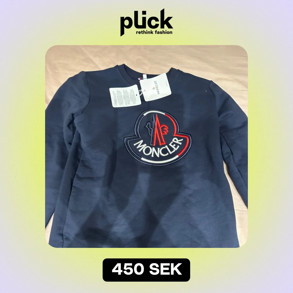 Säljer en snygg mörkblå tröja från Moncler med deras ikoniska logga broderad på framsidan. Tröjan har långa ärmar och är perfekt för både höst och vinter. Den är i mycket bra skick och passar perfekt för en stilren look.