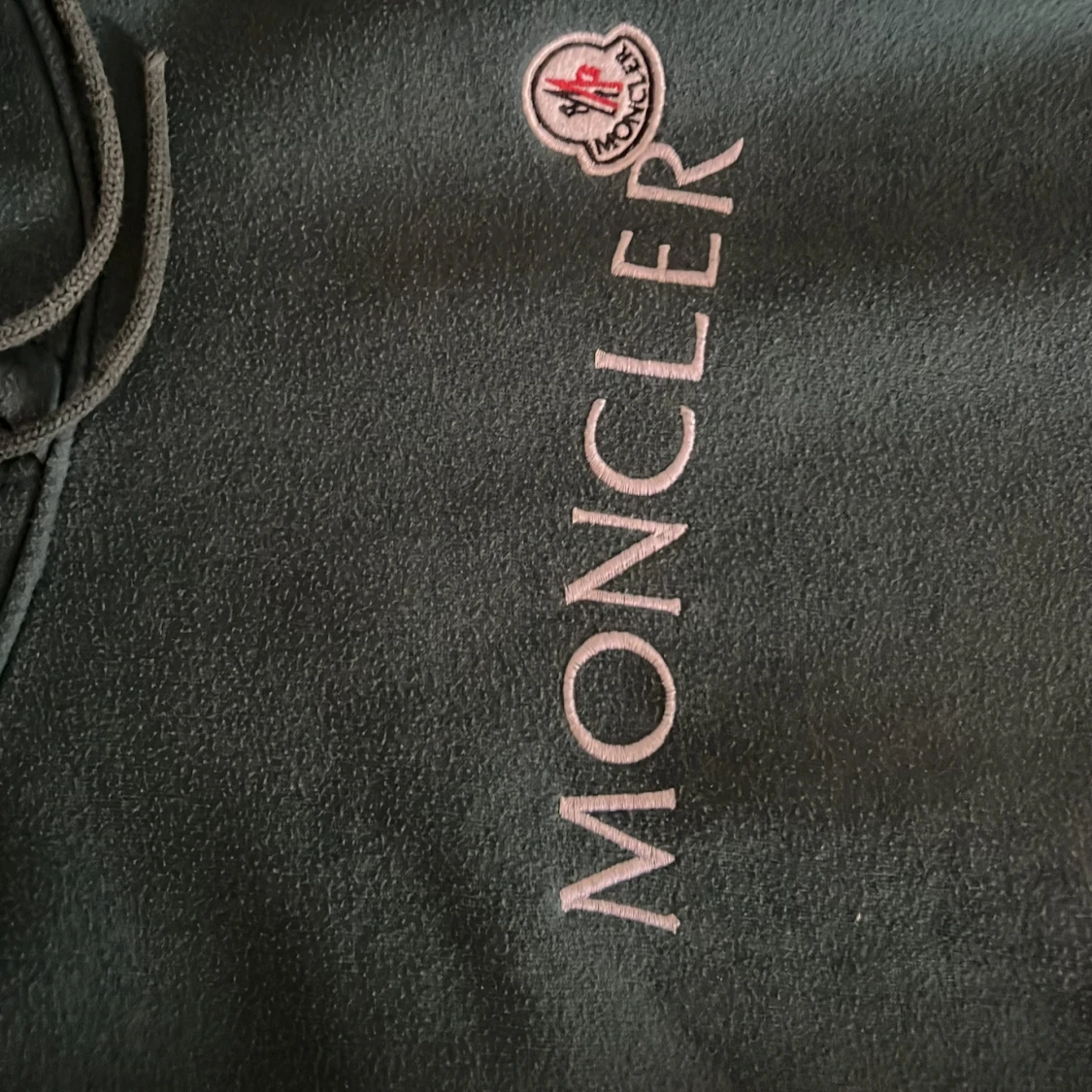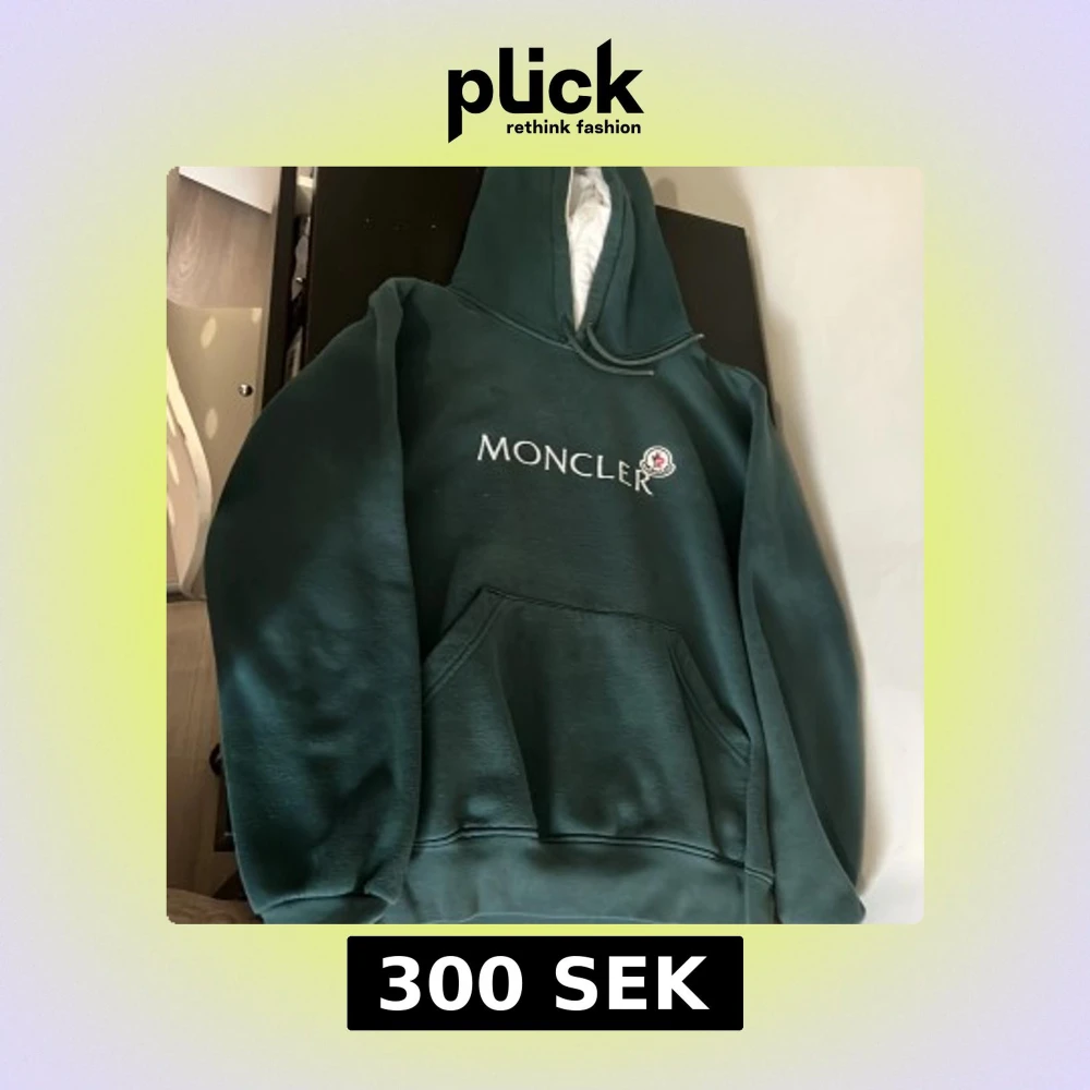 Säljer en snygg grön hoodie från Moncler med vit logotyp på bröstet. Den har en praktisk magficka och en justerbar huva med vitt foder. Perfekt för en avslappnad stil.