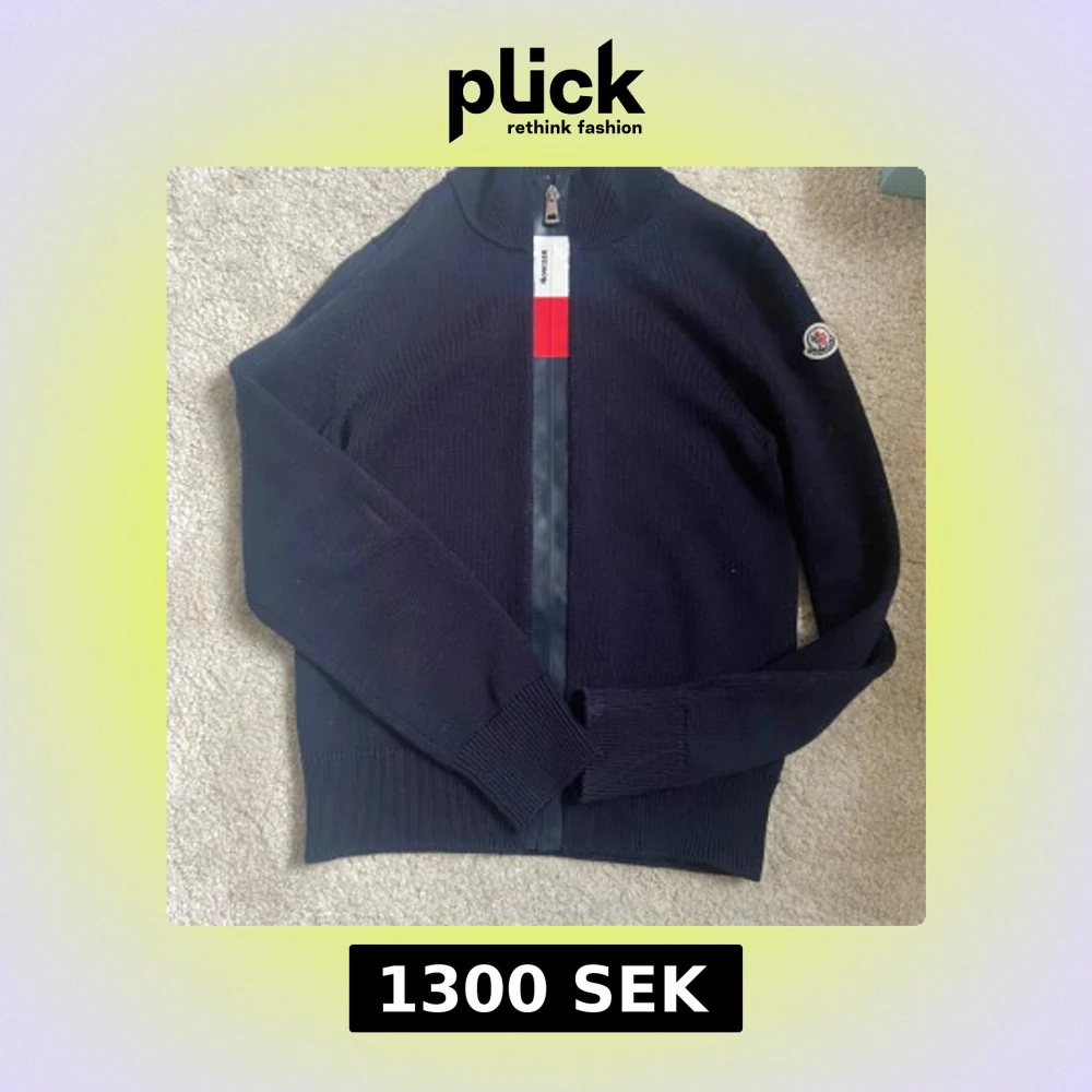 Säljer en mörkblå stickad tröja från Moncler med dragkedja framtill och Moncler-logga på ärmen. Tröjan har ribbade muddar och en hög krage. Snygg detalj med röd och vit rand längs dragkedjan.