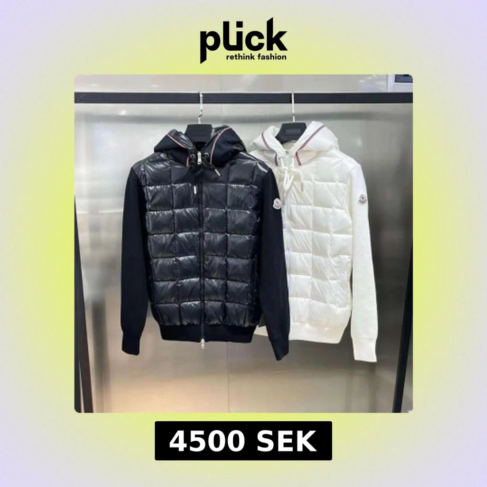 Två stilrena pufferjackor från Moncler, en i svart och en i vit. Båda har huva och dragkedja framtill. Jackorna har långa ärmar och är quiltade för extra värme. Perfekta för kyligare dagar.