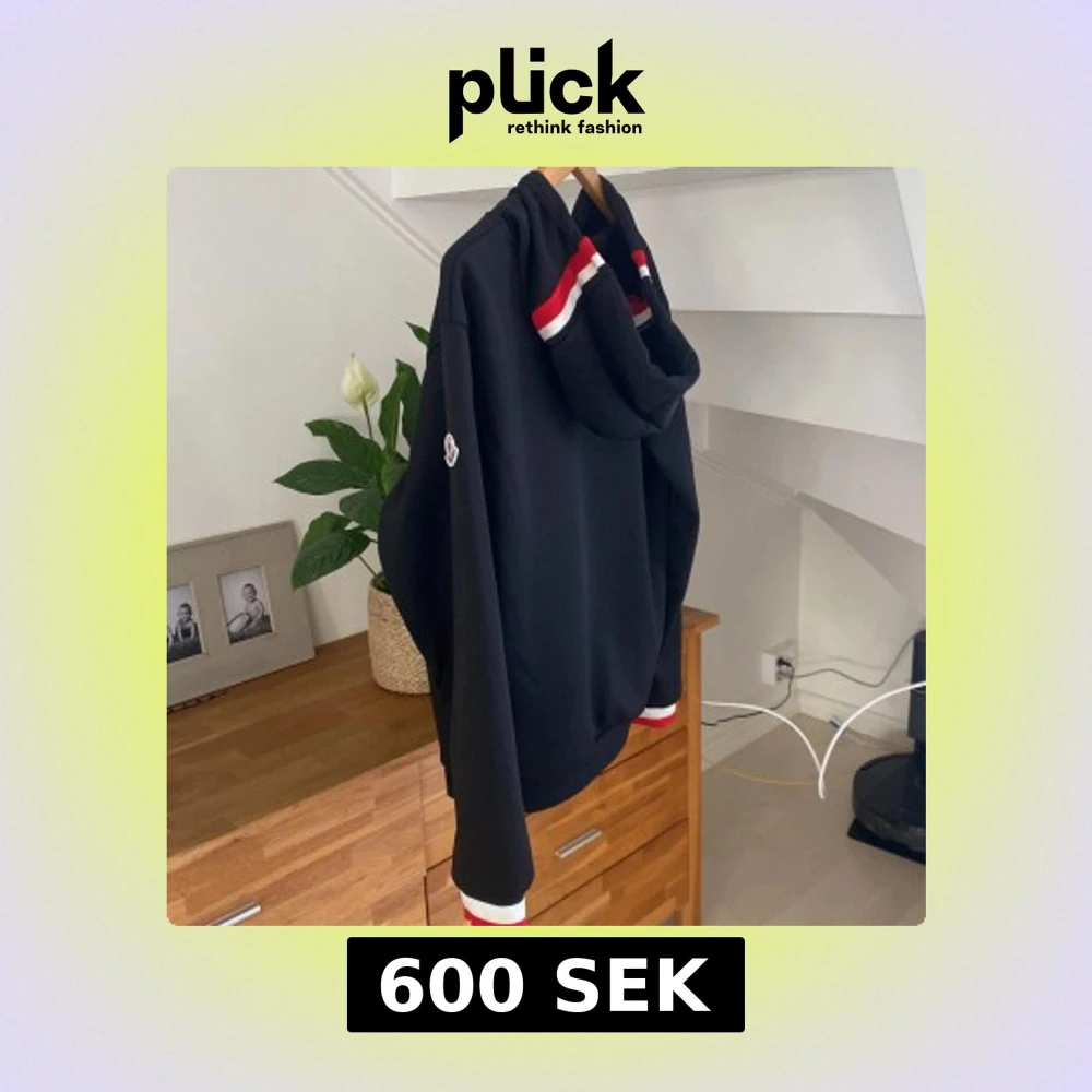 Svart hoodie med dragkedja från Moncler. Tröjan har huva, fickor framtill och ribbade muddar med röd och vit rand. Moncler-logga på ärmen och sportig känsla med detaljer i rött och vitt.