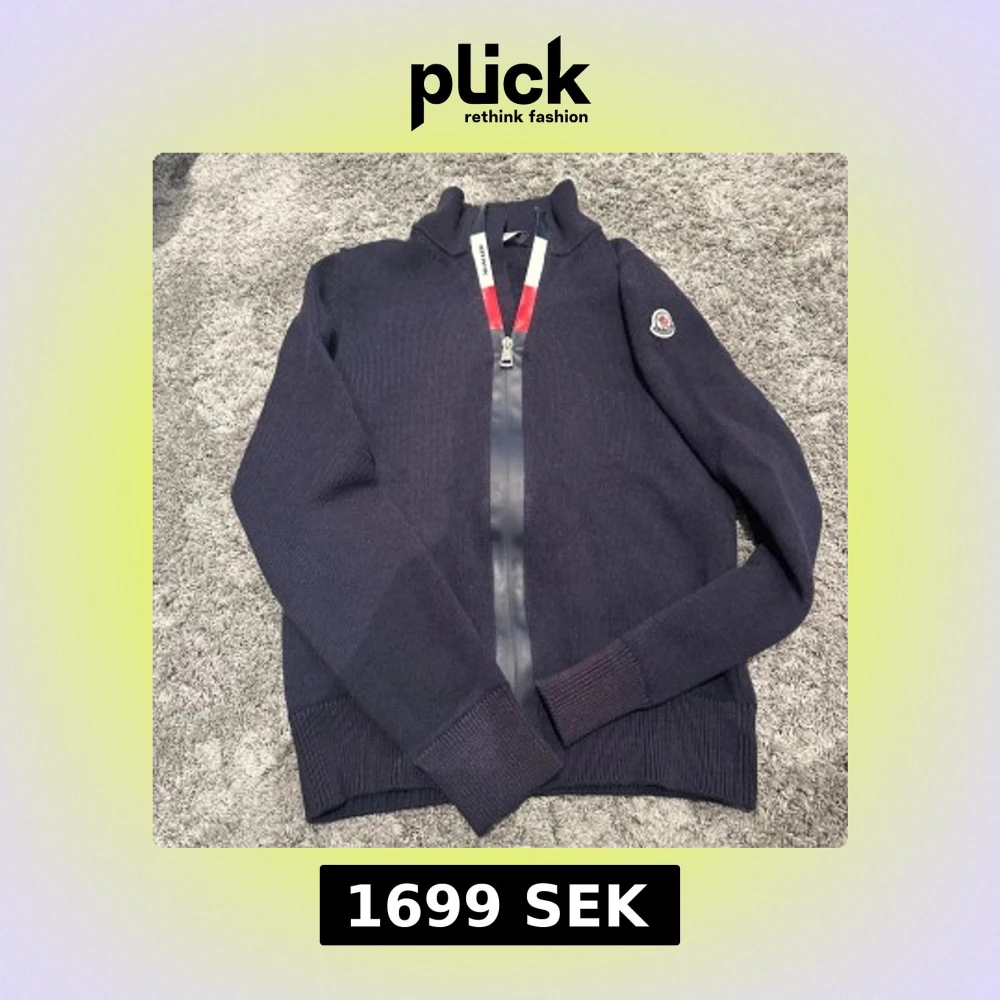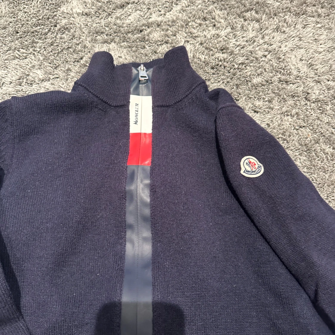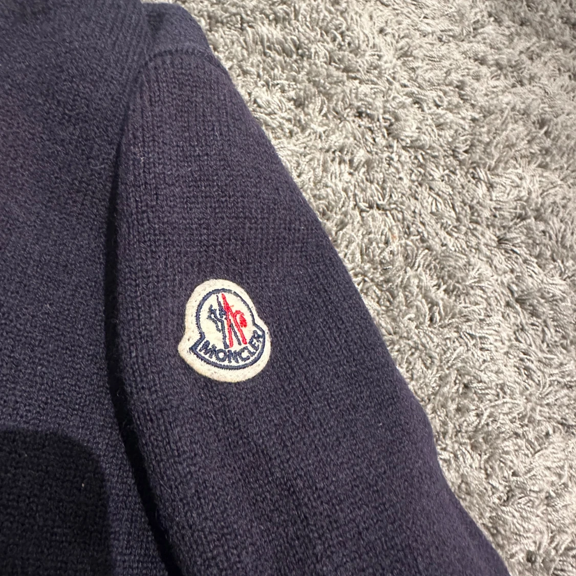 Mörkblå cardigan från Moncler med hög krage och hel dragkedja framtill. Klassisk Moncler-logga på ärmen och snygga ribbade muddar. Ny pris 4999 storlek (164)
