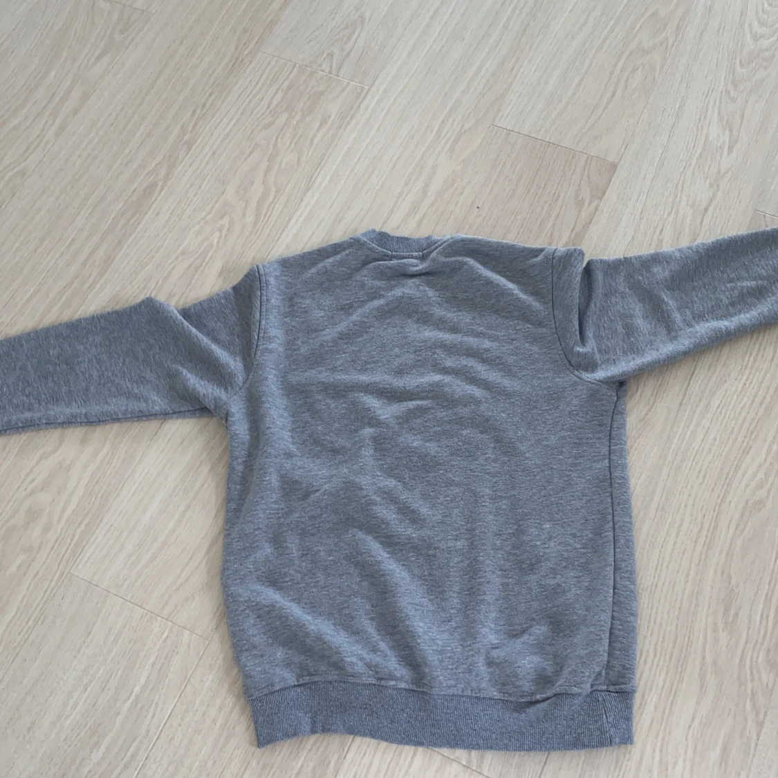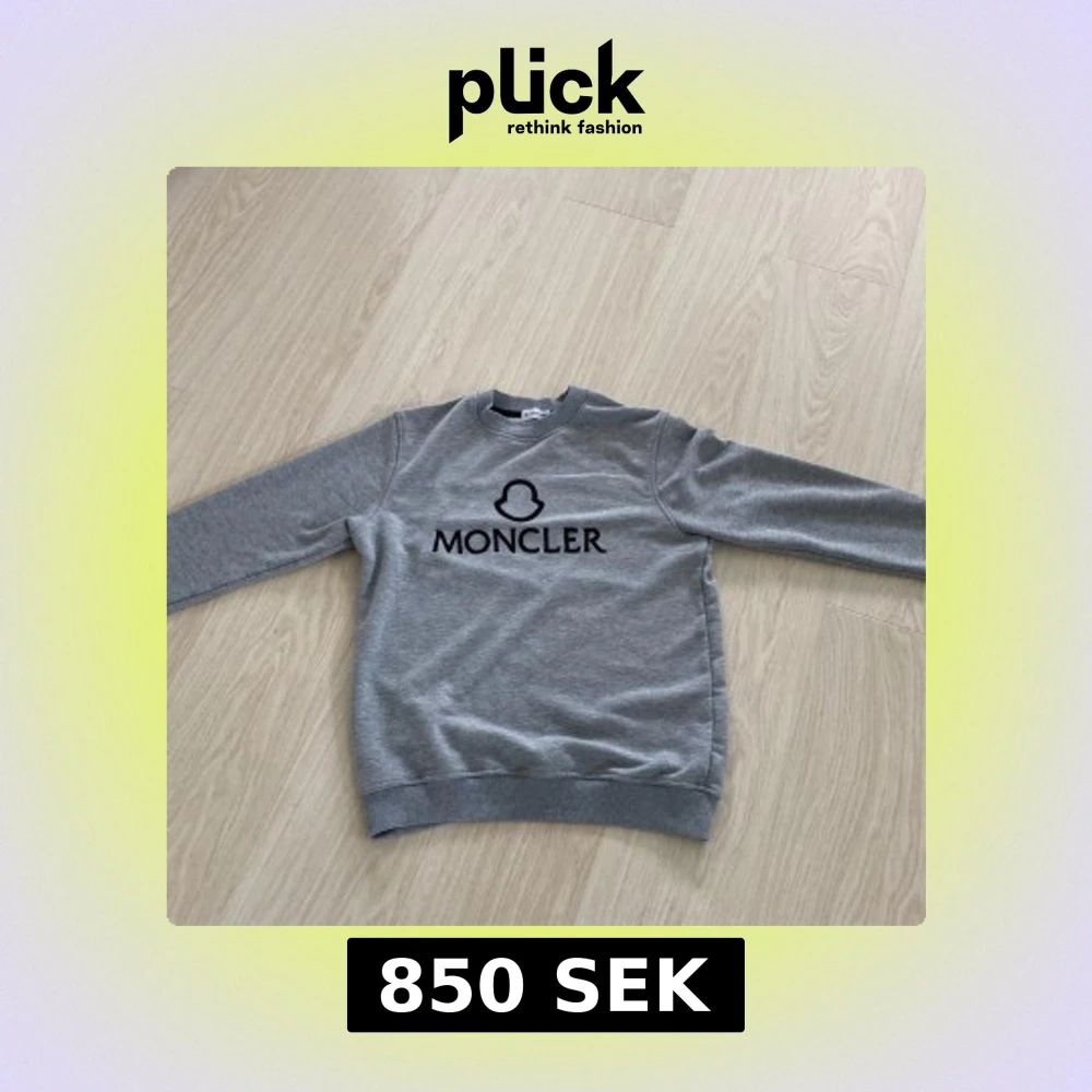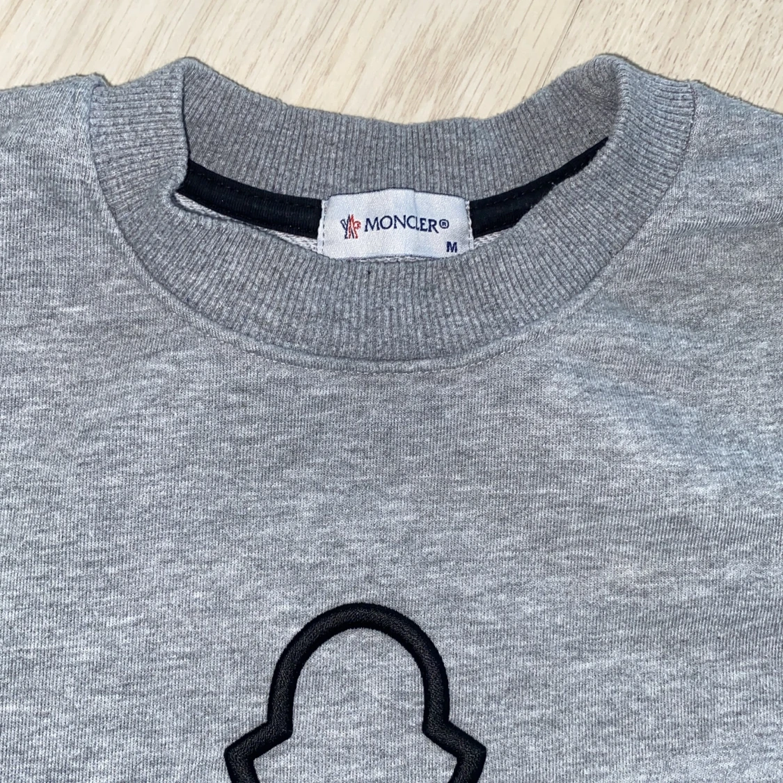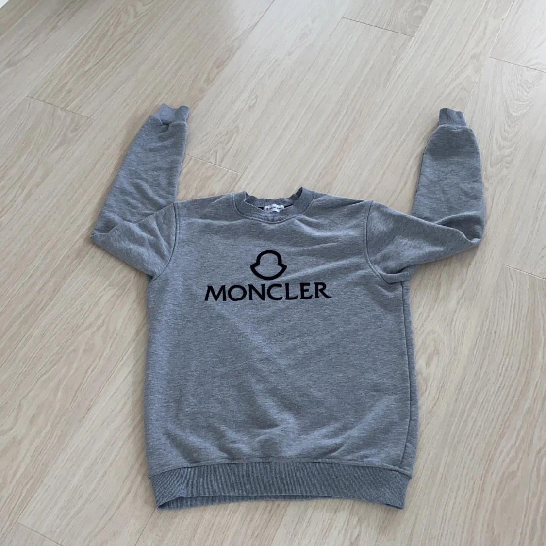 Säljer en stilren grå sweatshirt från Moncler med svart logotyp och tryck på bröstet. Tröjan har rund halsringning, långa ärmar och ribbade muddar vid ärmslut och nederkant. Perfekt för en avslappnad och trendig look.
