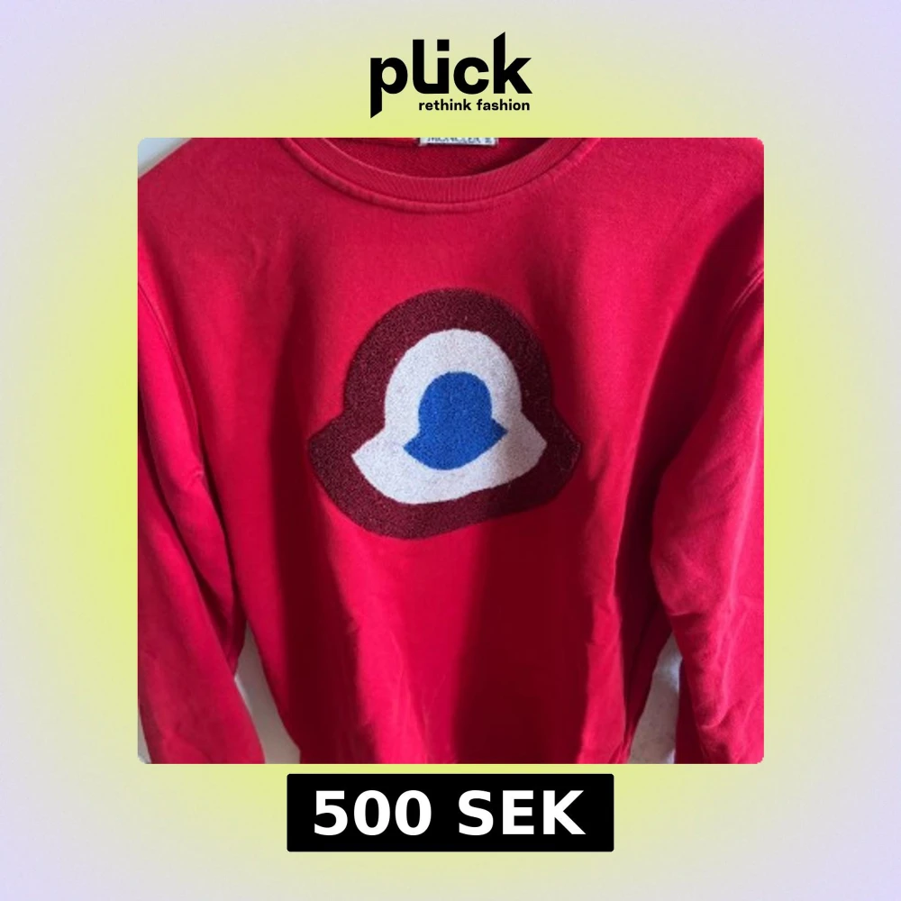 Säljer en snygg röd tröja från Moncler med ett stort broderat märke på framsidan i blått och vitt. Tröjan har en klassisk rund hals och är perfekt för en stilren look. Passar bra till både jeans och chinos.
