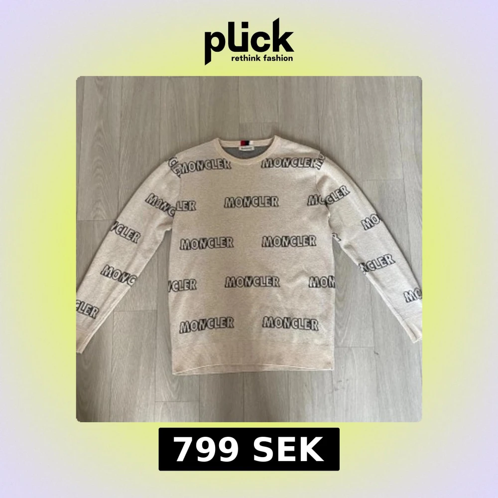 Beige stickad tröja från Moncler med svart logotypmönster över hela plagget. Rund halsringning och långa ärmar. Tröjan har ribbade muddar och en clean, modern look som sticker ut med sitt tydliga Moncler-tryck. Storlek L men passar M!