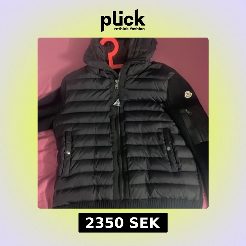Säljer en svart pufferjacka från Moncler med huva och dragkedja. Jackan har quiltade partier framtill och på ryggen, samt släta ärmar med Moncler-logga på vänster arm. Två fickor med tryckknappar framtill och ribbad nederkant.