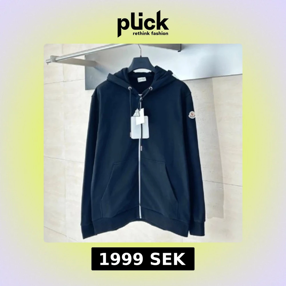 Svart hoodie från Moncler med vit logga på huvan och patch på ärmen. Tröjan har hel dragkedja, snörning i huvan och två stora fickor framtill. Tillverkad i mjuk bomull och har en clean, stilren look som passar perfekt till streetwear.