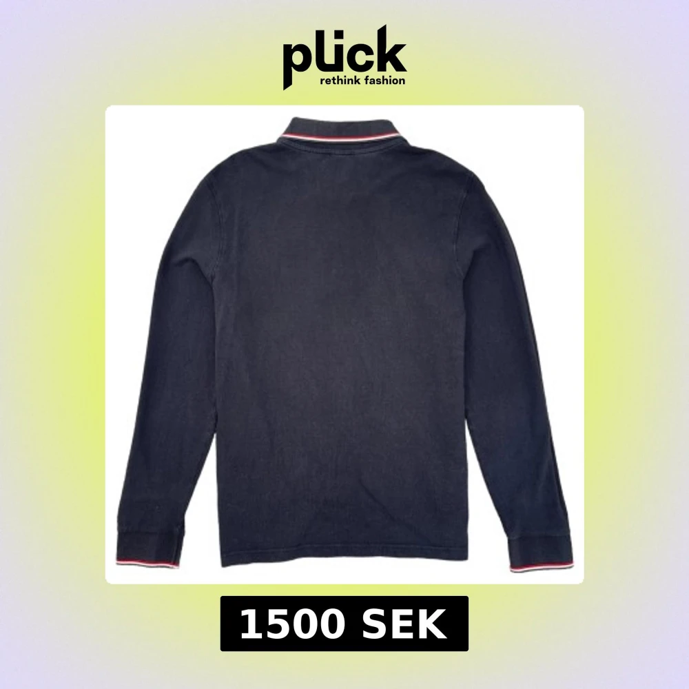 Snygg svart pikétröja från Moncler med långa ärmar och klassisk krage. Tröjan har en liten logotyp på bröstet och röd-vit randdetalj vid krage och ärmslut. Perfekt för en stilren look.