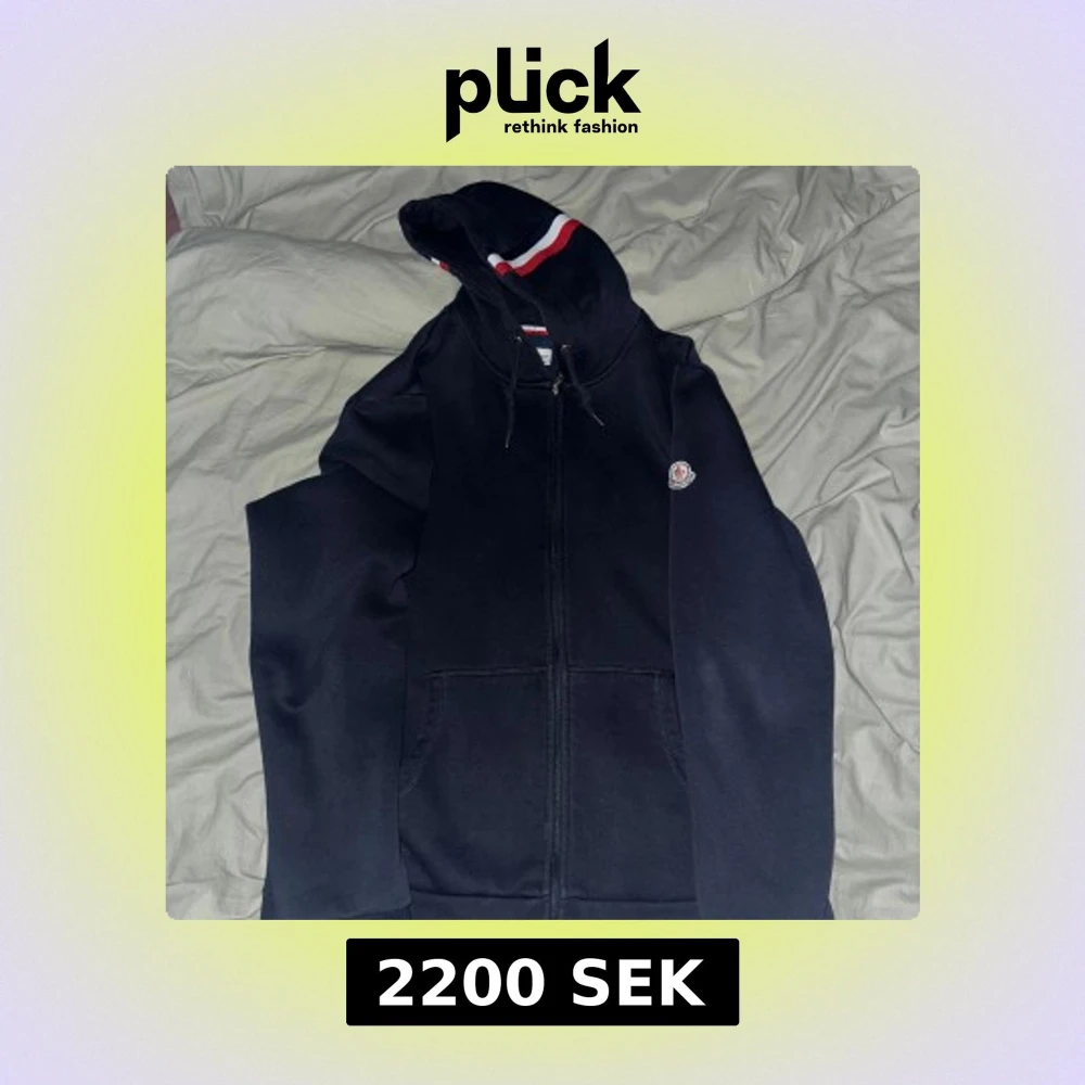 Svart hoodie från Moncler med hel dragkedja, huva med röd och vit rand samt broderad logga på bröstet. Tröjan har känguruficka och långa ärmar. Perfekt för dig som gillar stilrena och exklusiva streetwear-plagg.