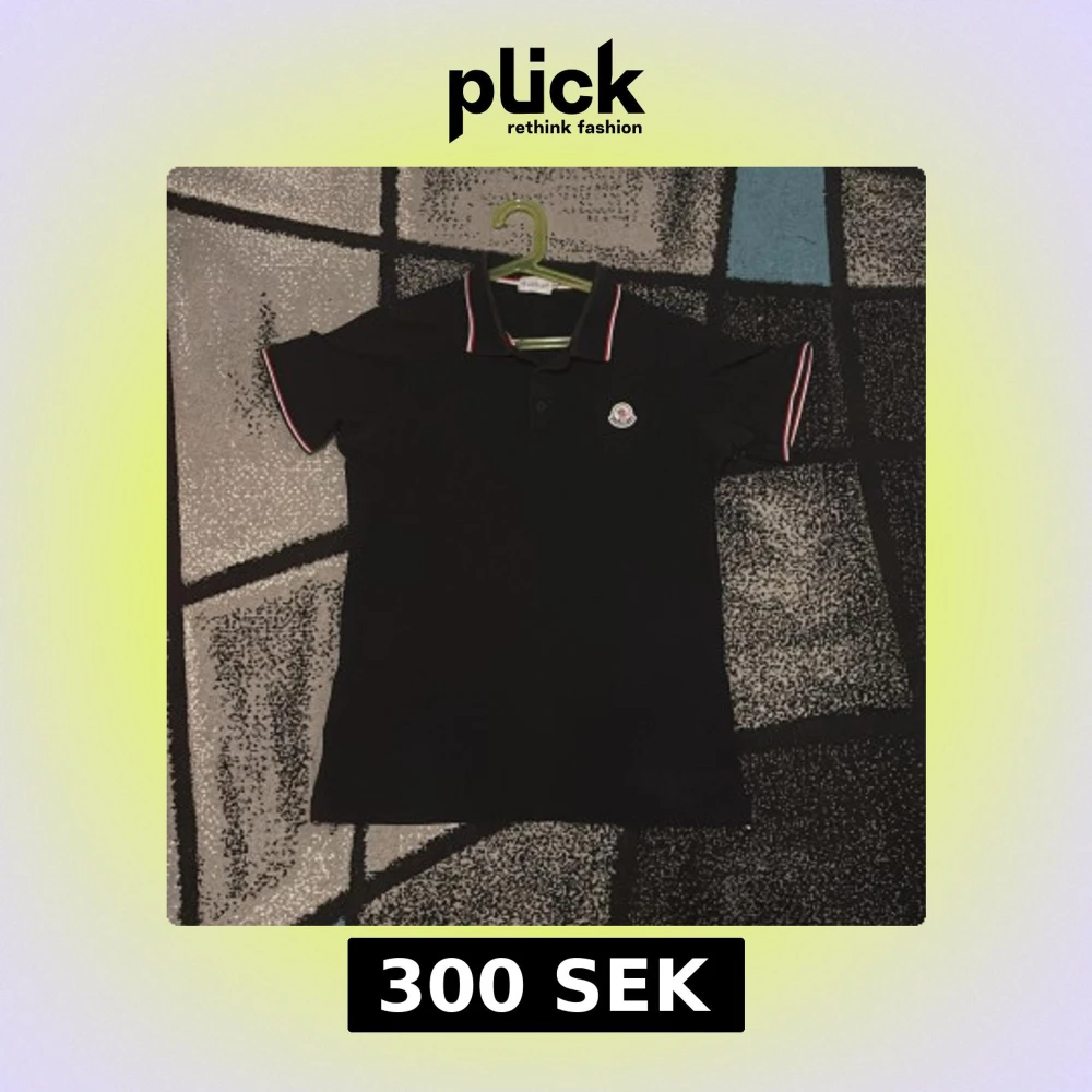 Svart pikétröja från Moncler med klassisk krage och knäppning framtill. Tröjan har röda och vita ränder på krage och ärmslut samt Moncler-logga på bröstet. Perfekt för en clean och sportig stil.