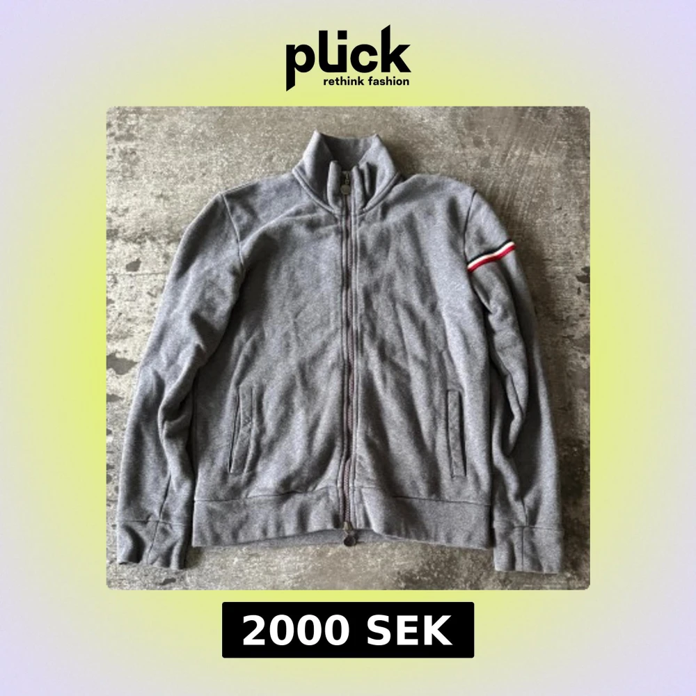 Grå zipjacka från Moncler med ståkrage och hel dragkedja. Jackan har Moncler-logga på ärmen och en röd-vit-blå randdetalj. Tillverkad i mjuk bomullsmix, två fickor framtill och ribbade muddar. Perfekt för en clean och sportig look.Den är köpt från Merch sweden och jag har kvitto om det är behövligt och den är lite mindre i storleken så skulle säga att den sitter som en S