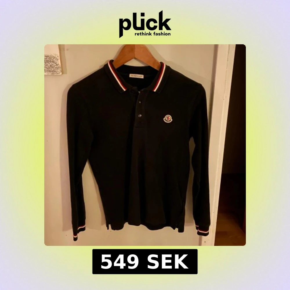 Svart långärmad pikétröja från Moncler med klassisk krage och knäppning framtill. Tricolore-detaljer i rött, vitt och blått på krage och ärmslut samt broderad Moncler-logga på bröstet. Tillverkad i mjuk bomull för en clean och stilren look. Köpt på NK för några år sedan. Taggen har tyvärr suddats ut litegrann i tvätten men går ibland att hitta den med kamera. Storleken är 14/164cm vilket motsvarar ungefär XS vuxenstorlek och passar dig som är 160-170cm lång ungefär. Pris kan såklart diskuteras