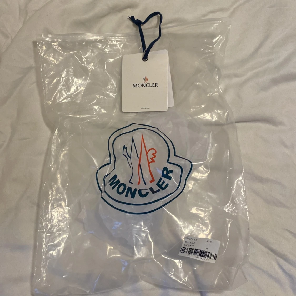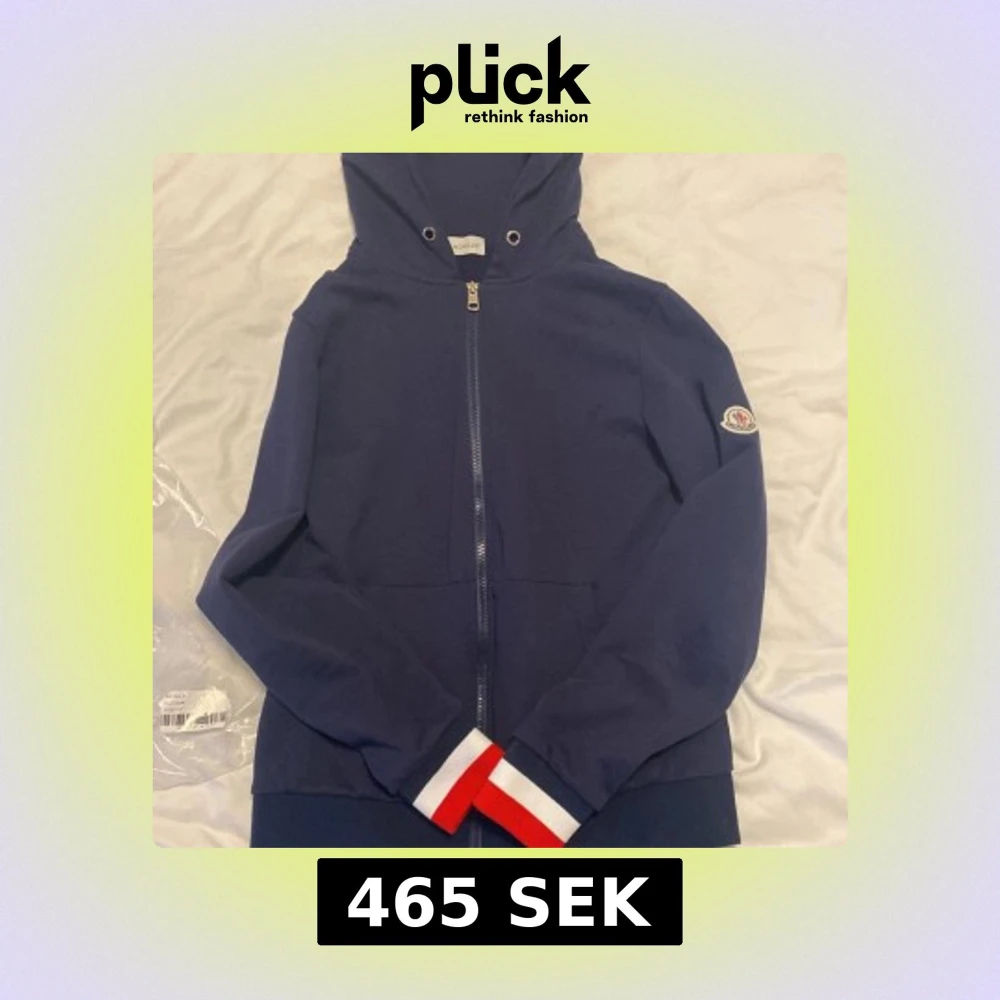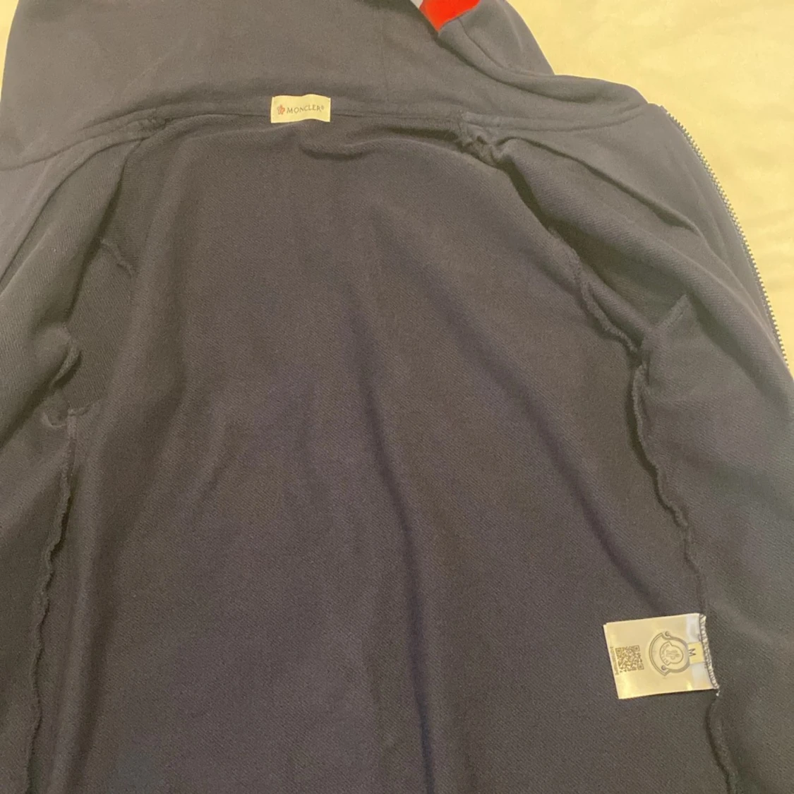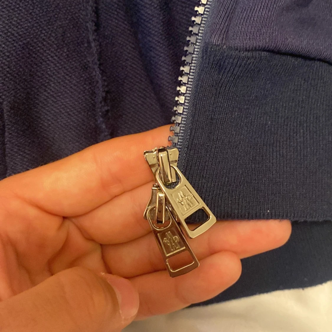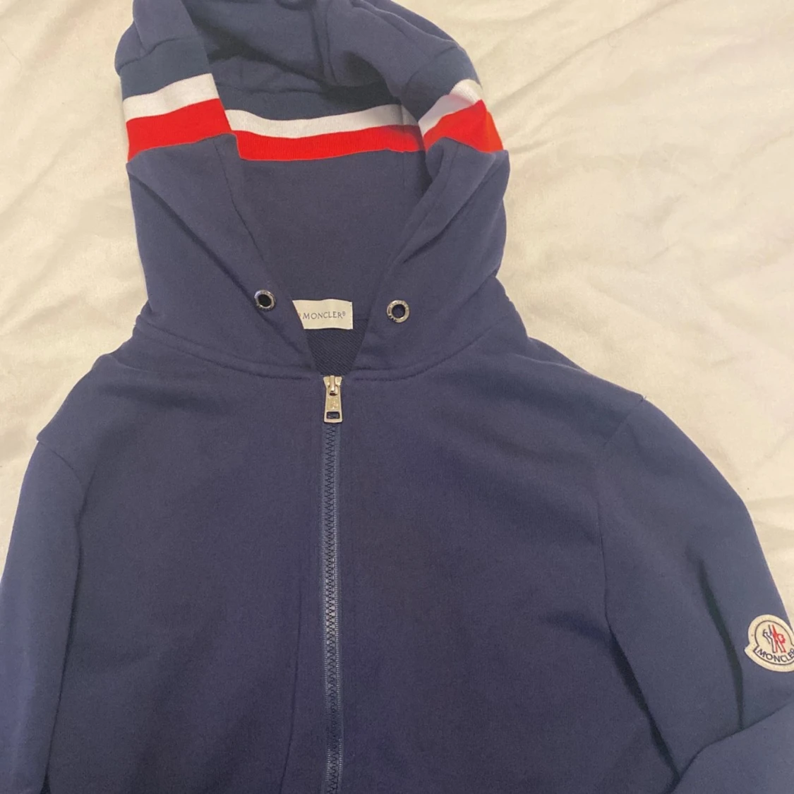 Snygg marinblå hoodie från Moncler med hel dragkedja och dubbla zippar. Huva med röda och vita ränder på insidan, samt klassisk Moncler-logga på ärmen. Pris går att diskutera. De står storlek M men passar inte M passar xs och S. Använt den 3 gånger